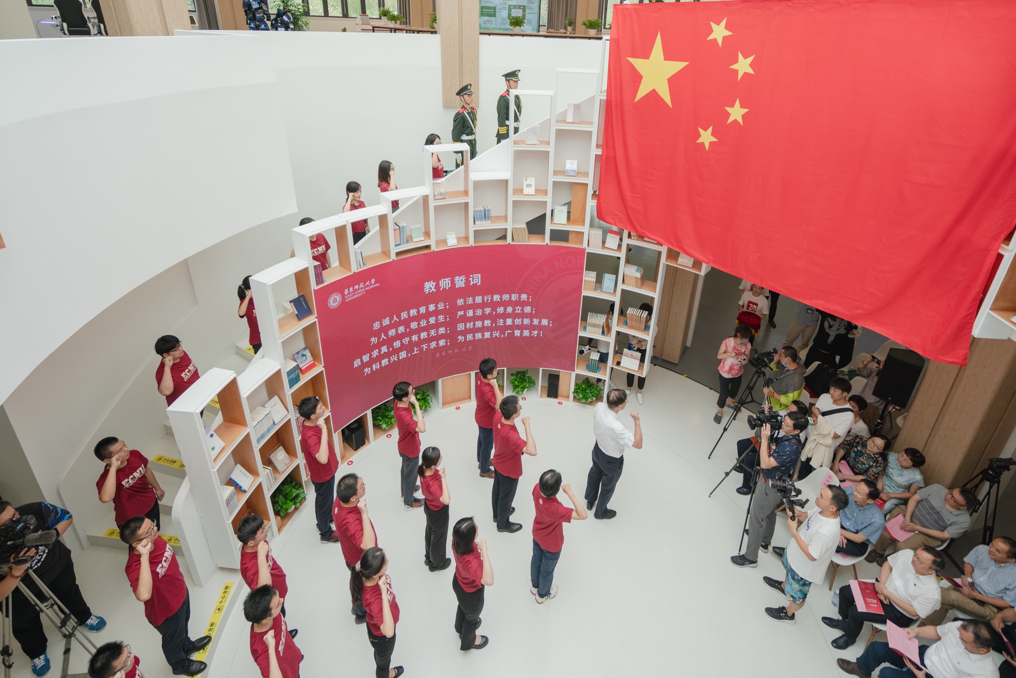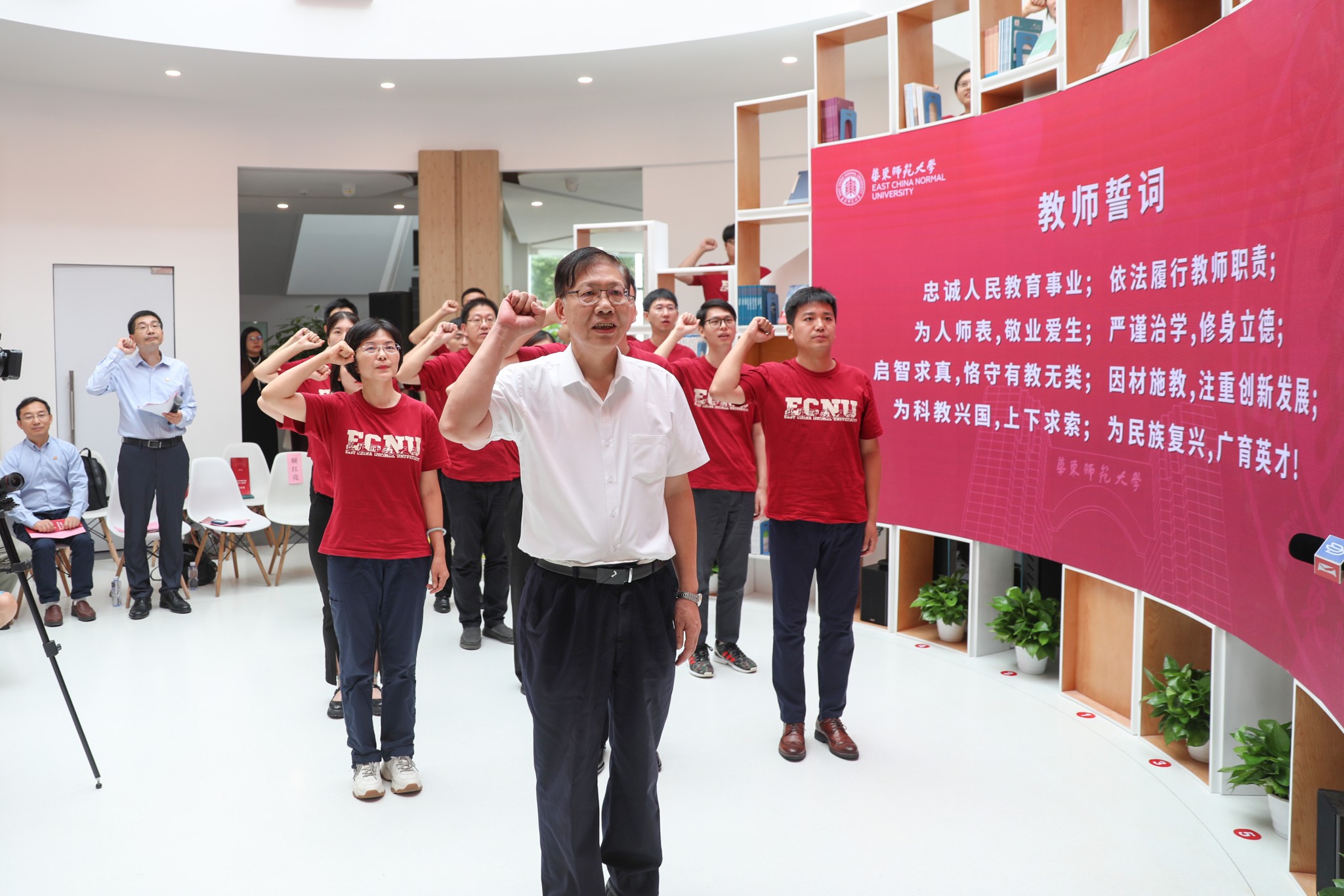 “為科教興國上下求索,為民族復興廣育英才。”華東師大今年新入職的教師代表在國家教學名師、華東師大地理科學學院鄭祥民教授的帶領下面向國旗莊嚴宣誓。