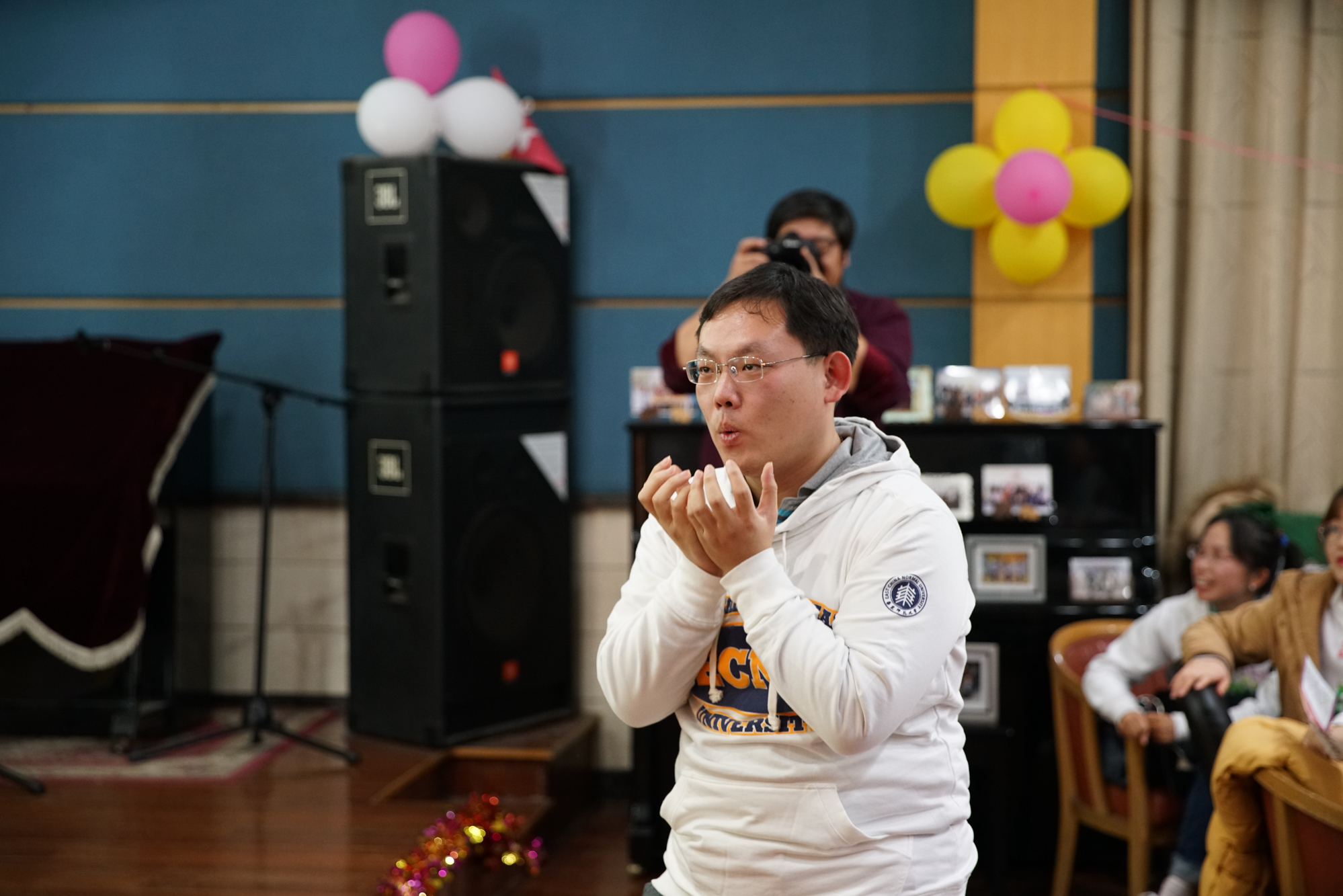 在第一個游戲環節你畫我猜中,平時工作忙碌的輔導員們展現了可愛和活潑的一面,引得全場笑聲不斷。之后,孟憲承書院、大夏書院、光華書院的合唱《軍港之夜》,音樂學院輔導員杜明月的朗誦《春天,遂想起》,學工部賽依努爾和設計學院張靜以及她的小伙伴們帶來的舞蹈《多彩青春》等節目,充分展現了輔導員隊伍的青春活力。
