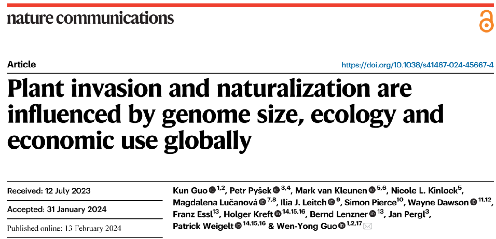 2月13日,Nature Communications 期刊在線刊登了華東師范大學(xué)生態(tài)與環(huán)境科學(xué)學(xué)院和浙江天童森林生態(tài)系統(tǒng)國(guó)家野外科學(xué)觀測(cè)研究站郭文永研究員團(tuán)隊(duì)的成果 Plant invasion and naturalization are influenced by genome size, ecology and economic use globally 。該研究提出了一個(gè)多要素-生物入侵概念框架(圖1),并基于全球尺度上歸化和入侵植物的多維信息數(shù)據(jù)(圖2:分布范圍、經(jīng)濟(jì)利用價(jià)值、基因組大小、生態(tài)適應(yīng)策略和本土分布區(qū)大小等)解析了多維要素驅(qū)動(dòng)全球外來植物入侵的關(guān)鍵因子和作用路徑。