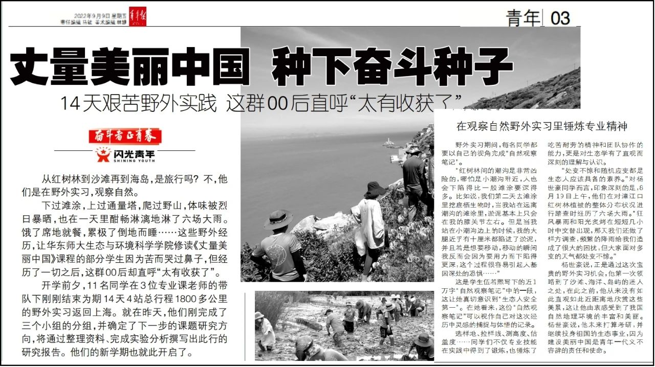 而在學院開設的《丈量美麗中國》課程中,楊世豪則作為班長協助老師帶領同學們一起,從福建漳州到浙江舟山,再到東山島、衢山島、東極島,他們不僅考察了沿海地區的生態環境,了解了當地的風土人情,還在實踐中培養了專業興趣和動手能力。課程結束后,楊世豪還代表班級接受了青年報記者的采訪。