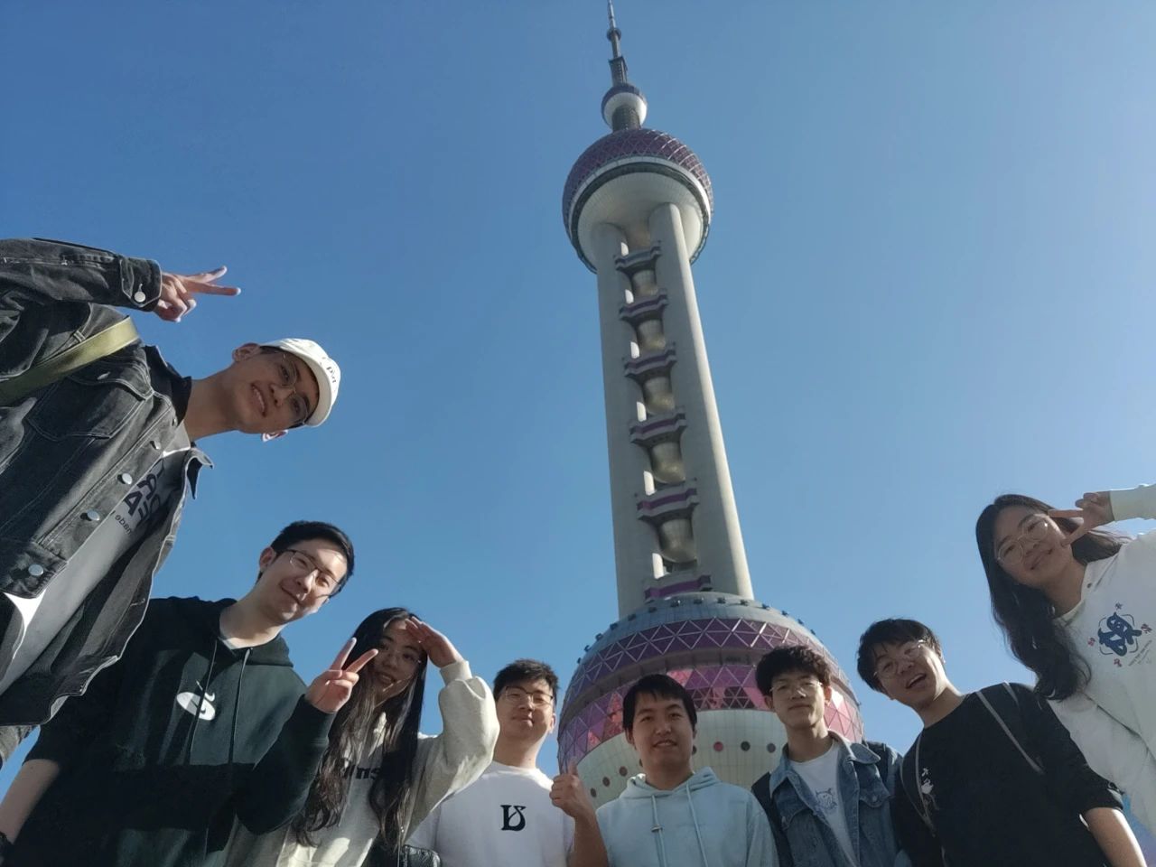 王瑋烽(右四)和同學們在東方明珠塔下合影