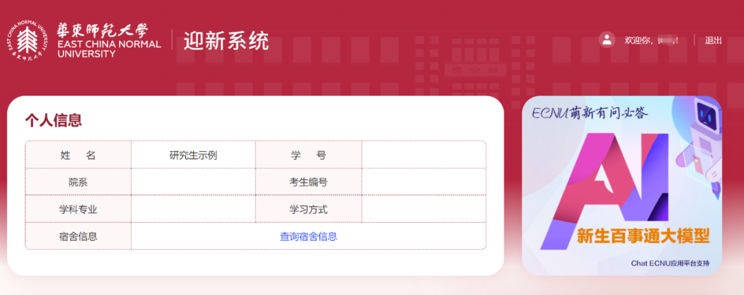登錄“迎新系統”(https://freshman.ecnu.edu.cn)向“新生百事通大模型”提問或查詢“迎新資訊”。