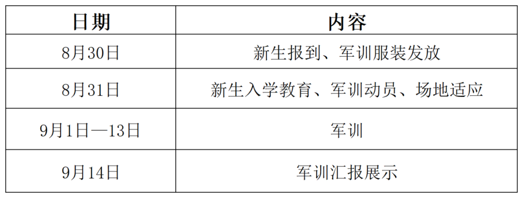 如遇高溫、下雨等其他情況,訓練時間將進行適當調整。軍訓室外訓練場地為兩校區運動場,最新連隊位置、時間和場地等信息以后續通知為準。