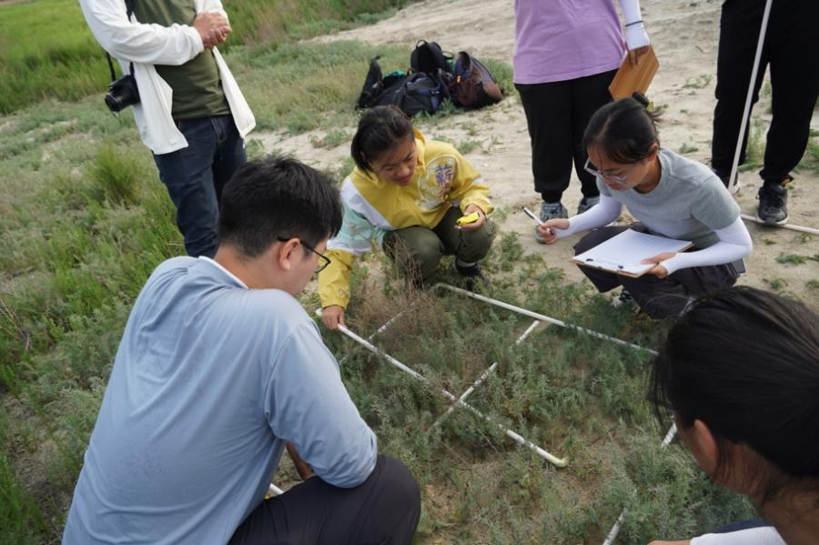 轉(zhuǎn)戰(zhàn)寧夏中衛(wèi),沙坡頭野外站內(nèi)一片片防風(fēng)固沙試驗(yàn)田是無(wú)數(shù)研究者對(duì)抗風(fēng)沙的堅(jiān)韌宣言,漫天黃沙中素未謀面的沙生植物展現(xiàn)著生命的頑強(qiáng)。吳忠水稻田里,學(xué)生們穿梭其間采樣的同時(shí),也領(lǐng)略著“天下黃河富寧夏”的豐富水資源,灌溉出西北干旱中的一抹翠綠與生機(jī)。內(nèi)蒙古騰格里的廣袤沙漠中,師生們?cè)谶M(jìn)行沙生植物樣方調(diào)查時(shí),偶遇荒漠麻蜥穿梭于沙冬青群落間,一場(chǎng)意外的“科學(xué)追逐”,讓本站課程變得更加刺激。