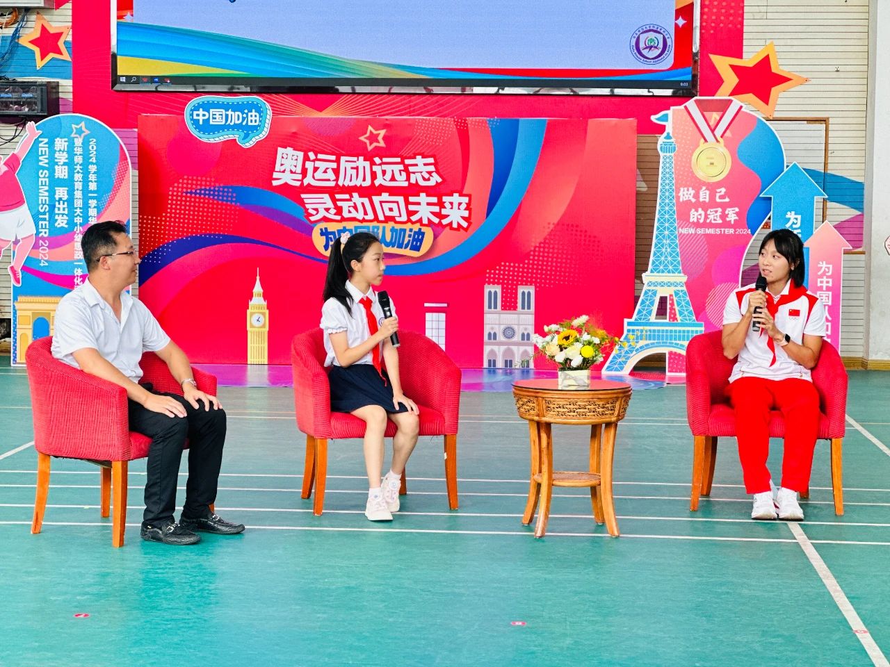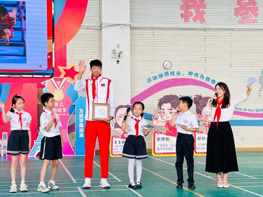 武術(shù)、足球、啦啦操、花樣跳繩、游泳、田徑……一群可愛的萌娃運動員們閃亮登場!9月2日,迎著清晨的第一縷陽光,華東師大附屬紫竹小學(xué)熱鬧非凡,“奧運勵遠(yuǎn)志,靈動向未來”2024學(xué)年第一學(xué)期開學(xué)典禮暨華東師大教育集團(tuán)大中小幼思政一體化活動舉辦。三位剛從巴黎奧運會凱旋的國家田徑隊運動員、華東師大在讀學(xué)生葛曼棋、林雨薇以及秦偉搏,亮相華東師大附屬紫竹小學(xué),與小朋友們進(jìn)行了“面對面”交流,因為他們還有一個身份——華東師范大學(xué)新時代宣講團(tuán)學(xué)生講師。