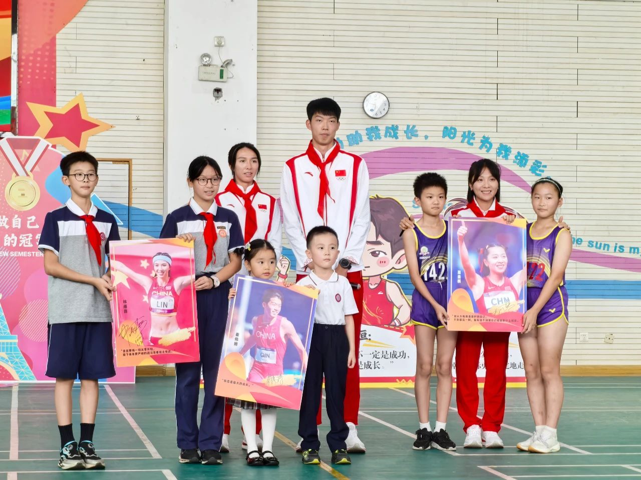 作為華東師范大學(xué)新時代宣講團(tuán)學(xué)生講師,三位奧運健兒在海報上簽名,與同學(xué)們合影。這些簽名海報將放在學(xué)校體育館,勉勵大家“勇于選擇、直面挑戰(zhàn)、滿懷熱愛”,激勵少年向榜樣學(xué)習(xí),做最好的自己。