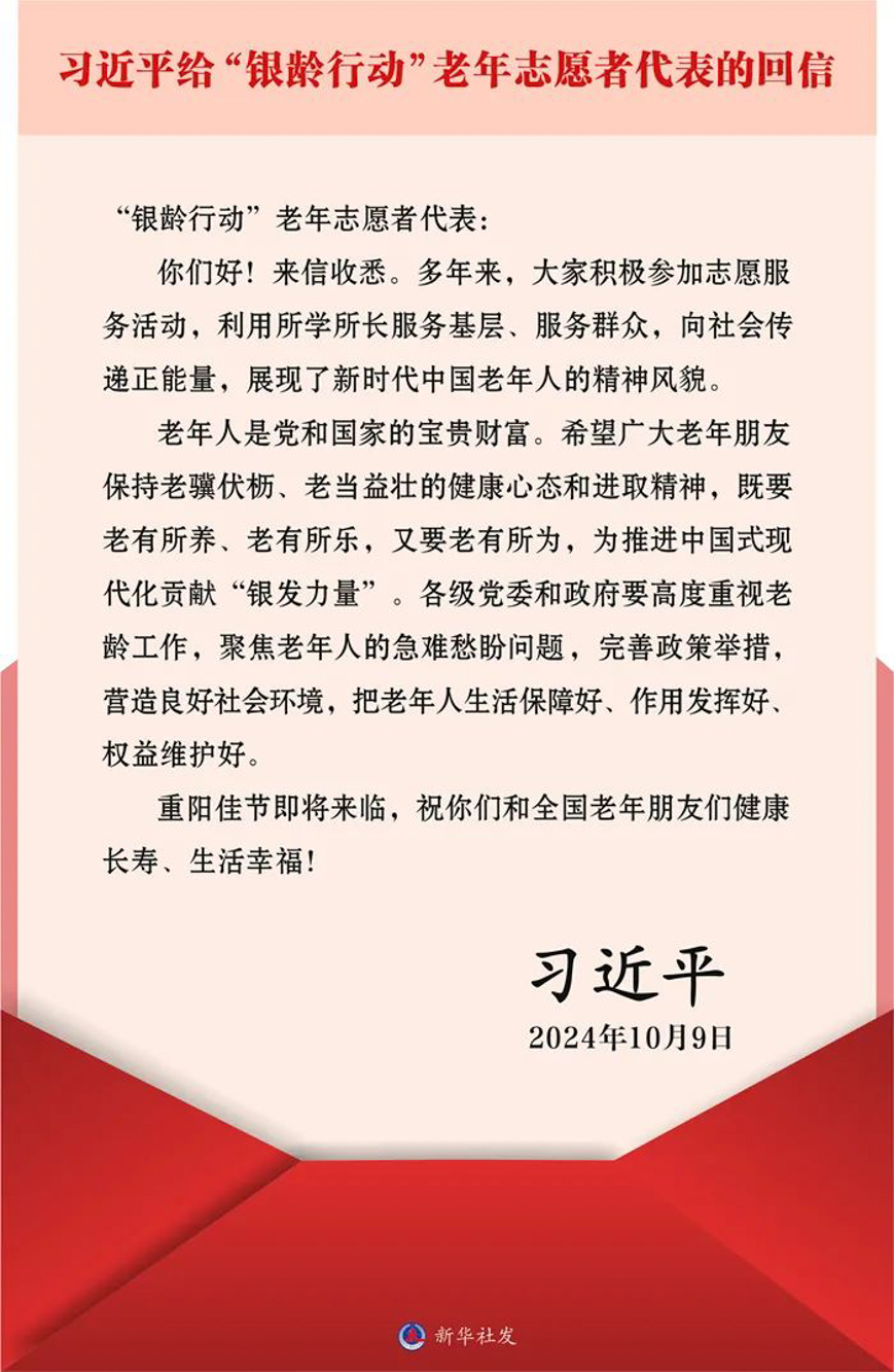 “歲歲重陽,今又重陽”。今天是農(nóng)歷九月初九,也是中華民族傳統(tǒng)節(jié)日——重陽節(jié)。在重陽節(jié)來臨之際,習(xí)近平總書記給“銀齡行動(dòng)”老年志愿者代表回信,對(duì)他們予以親切勉勵(lì),向全國的老年人致以誠摯問候。