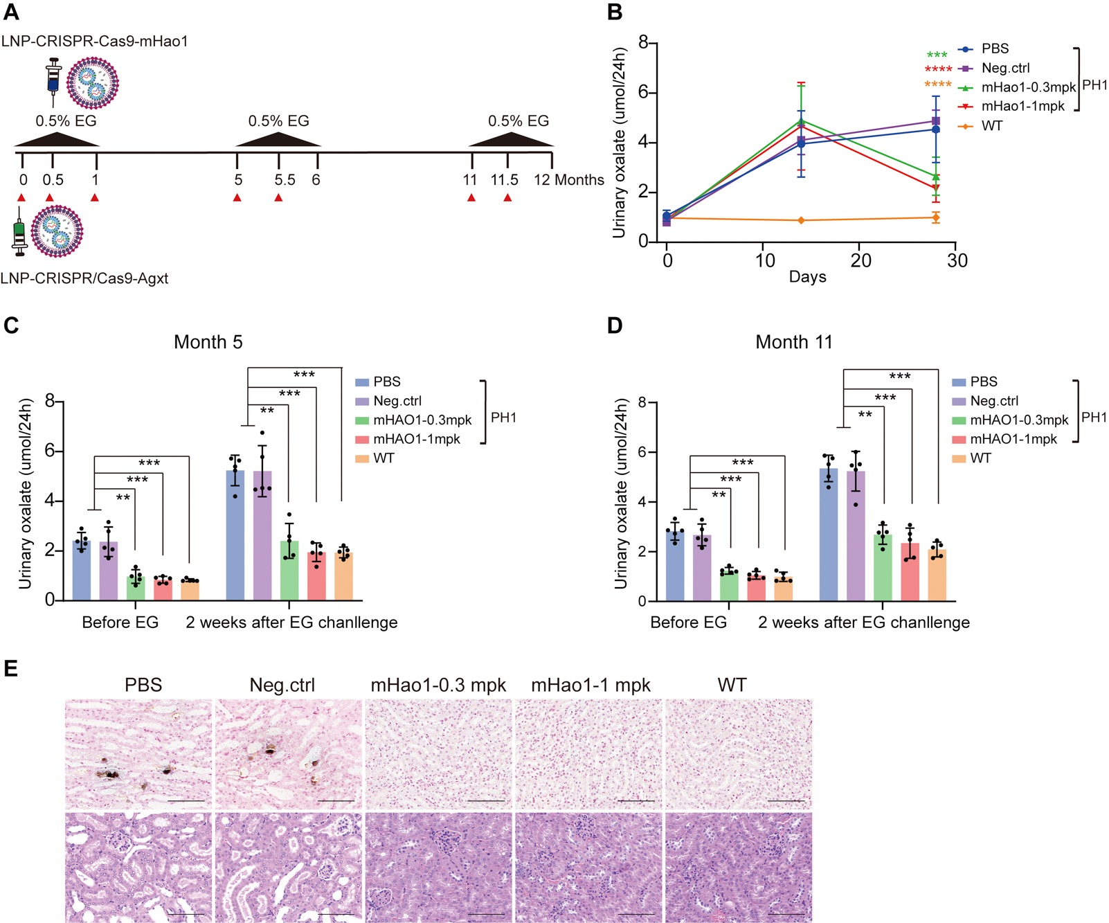 為了快速建立PH1模型小鼠,研究團隊通過LNPs遞送Cas9 mRNA和靶向Agxt的sgRNA,并在小鼠飲用水中添加0.5% 乙二醇(EG),成功建立了PH1小鼠模型,觀察到尿草酸水平升高及腎鈣質沉著,證實了建模方法的可靠性。隨后,研究團隊篩選了靶向小鼠Hao1基因的高效sgRNA, 利用LNP和Cas9 mRNA/Hao1-4 gRNA通過靜脈注射以低高劑量在PH1小鼠體內驗證該治療策略的有效性。在長達12個月的監測中,治療組顯示出穩定的編輯效率和持久的治療效果,尿草酸水平均顯著下降,且未觀察到腎鈣質沉著現象,提示該治療方法能顯著緩解PH1表型。