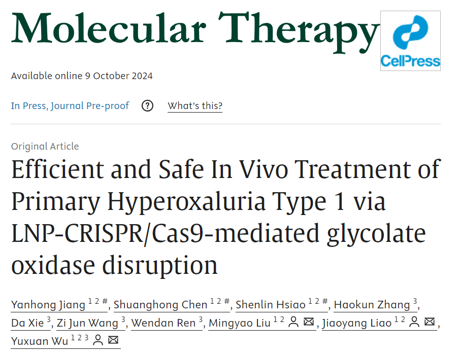 2024年10月,華東師范大學生命科學學院的吳宇軒研究員與堯唐生物合作,開發了一種脂質納米顆粒(LNPs)介導的體內基因編輯策略靶向敲降GO,成功在PH1小鼠體內實現了高效的基因編輯和穩定的降草酸效果。該研究成果以“Efficient and Safe In Vivo Treatment of Primary Hyperoxaluria Type 1 via LNP-CRISPR/Cas9-mediated glycolate oxidase disruption”為題,在線發表在《分子療法》期刊上。這一創新性方法首次將LNPs介導的體內基因編輯技術應用于PH1的治療,克服了siRNA頻繁給藥的困擾及AAV載體的安全性問題,實現了一次給藥便可長期獲益的效果,為PH1的治療開辟了新方向。