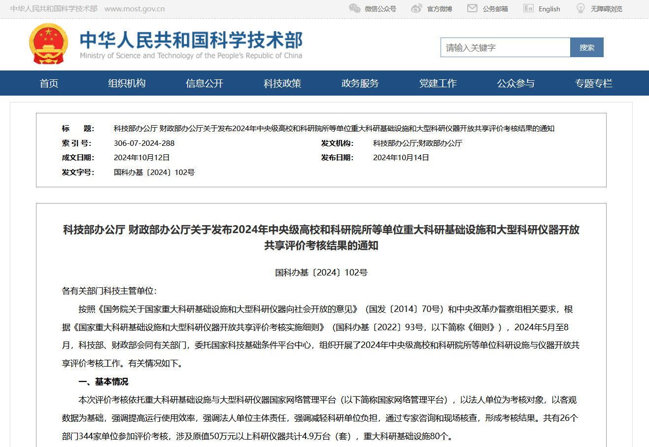 科技部辦公廳 財(cái)政部辦公廳關(guān)于發(fā)布2024年中央級(jí)高校和科研院所等單位重大科研基礎(chǔ)設(shè)施和大型科研儀器開(kāi)放共享評(píng)價(jià)考核結(jié)果的通知
