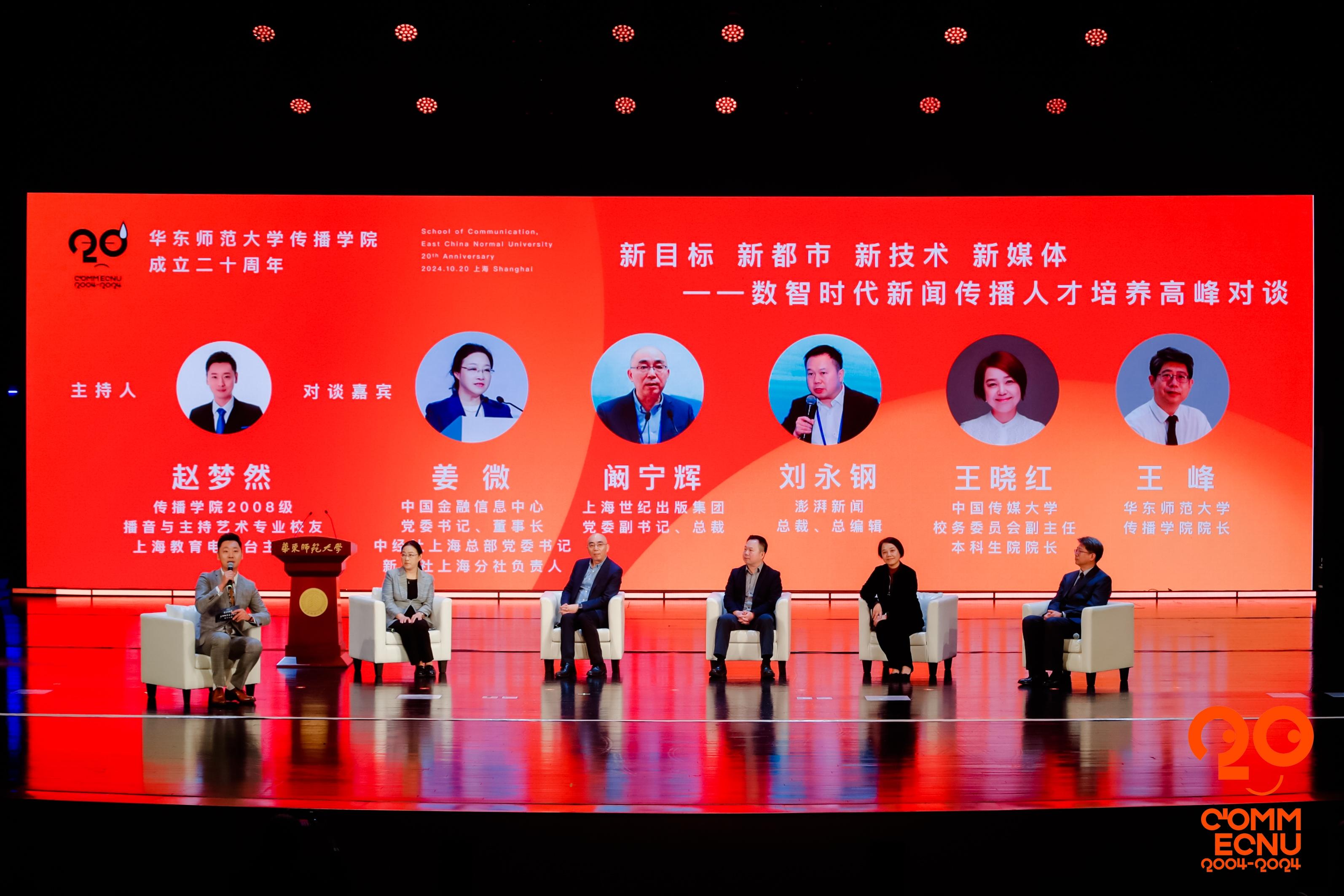 中國(guó)金融信息中心黨委書(shū)記、董事長(zhǎng)、中經(jīng)社上海總部黨委書(shū)記、新華社上海分社負(fù)責(zé)人姜微,上海世紀(jì)出版集團(tuán)黨委副書(shū)記、總裁闞寧輝,澎湃新聞總裁、總編輯劉永鋼,中國(guó)傳媒大學(xué)校務(wù)委員會(huì)副主任、本科生院院長(zhǎng)王曉紅和華東師范大學(xué)傳播學(xué)院院長(zhǎng)王峰等5位專家學(xué)者聚焦傳播學(xué)院《改革發(fā)展展望》主旨報(bào)告,展開(kāi)“新目標(biāo) 新都市 新技術(shù) 新媒體——數(shù)智時(shí)代新聞傳播人才培養(yǎng)高峰對(duì)談”。