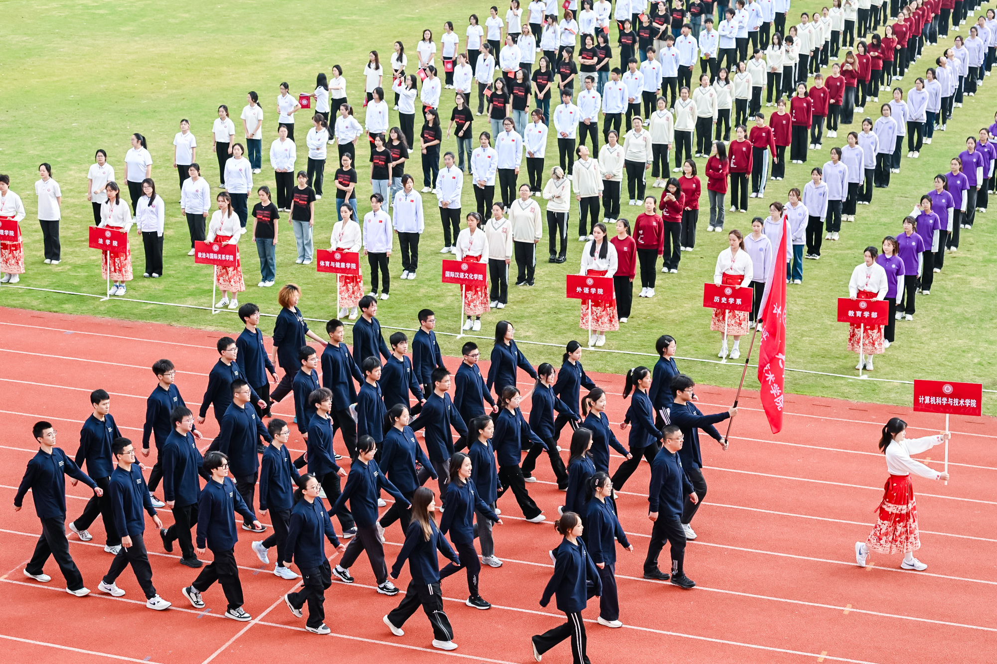 校黨委書記梅兵、校長錢旭紅、校黨委副書記曹友誼、副校長程靜等在主席臺觀摩。開幕式由體育與健康學(xué)院院長季瀏主持。校黨委書記梅兵宣布2024年華東師大運動會開幕。