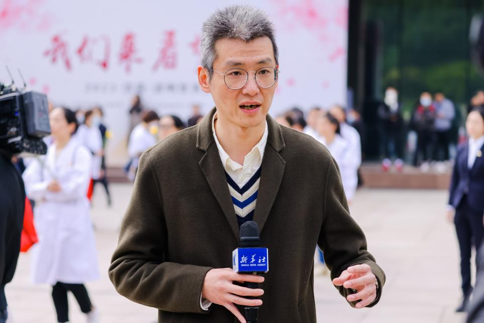2023年4月,2002級校友、新華社上海分社編委、音視頻部主任潘旭在龍華烈士陵園進行清明節報道