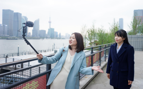 2021年,2011級校友、新民晚報記者楊歡在百年建黨報道 “黃埔碼頭”Vlog的拍攝現場