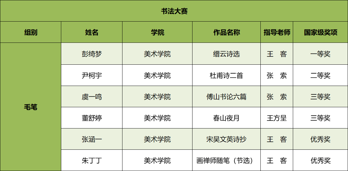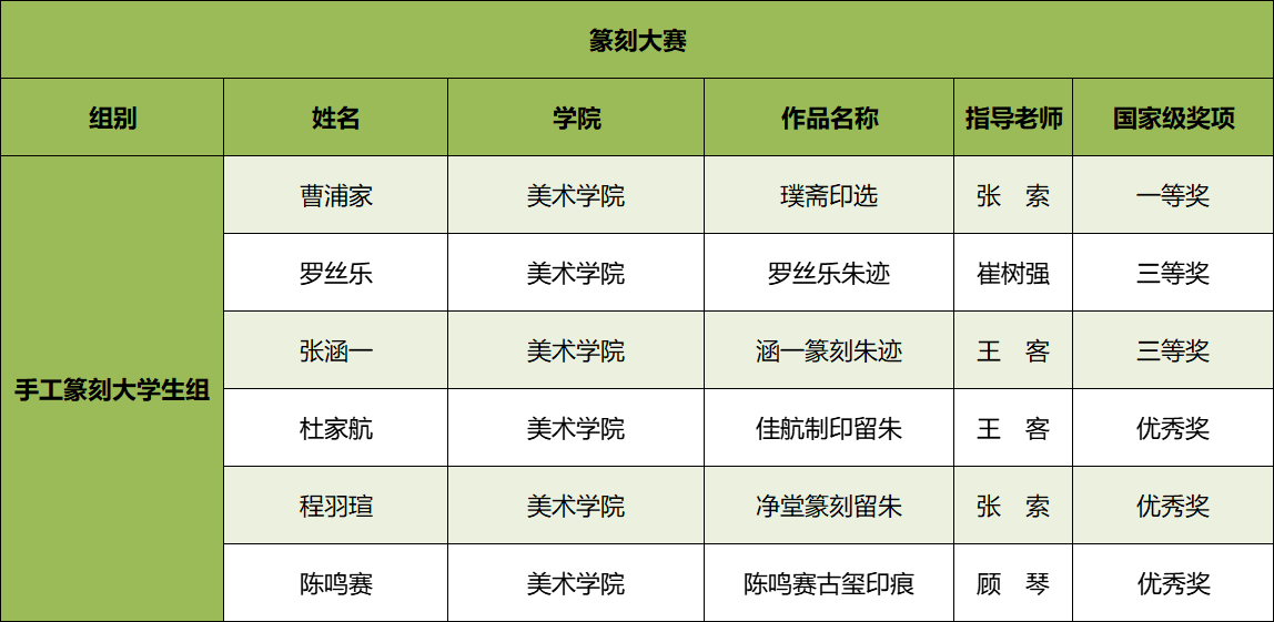 自2024年5月起,全校師生自主報名參賽,由相關院系(中文系、傳播學院、美術學院、國際漢語文化學院等)開展參賽作品選拔工作并進行賽前培訓,指導教師與參賽人員保持密切溝通,及時反饋修改意見、不斷優化參賽作品。10月底,經過激烈的角逐,四個賽道的國賽評審全部結束,我校師生參賽作品在全國評選中獲佳績,總計獲得國家級獎項20項(全國一等獎2項,二等獎2項,三等獎8項,優秀獎8項)。其中,篆刻大賽、書寫大賽均為上海市高校最好成績。
