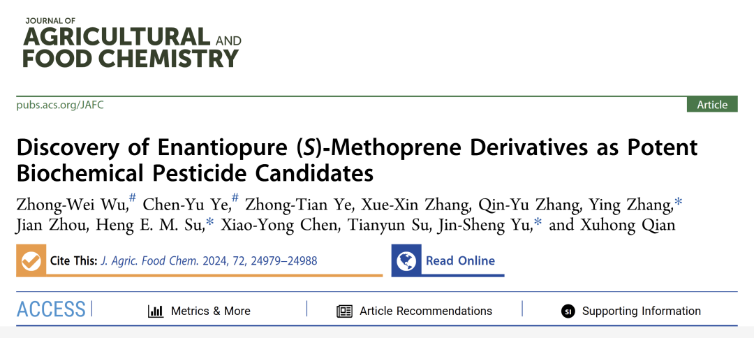 研究團隊通過對商業化成功的生物化學農藥S-烯蟲酯進行生物合理性的結構改造與優化,發現一例對小菜蛾具有很好羽化抑制效果的高活性類似物,具有很大潛力發展成為防治鱗翅目害蟲的生物化學農藥候選產品。該研究是S-烯蟲酯類化合物在農業害蟲防治領域的首次成功探索,成果“Discovery of Enantiopure(S)-Methoprene Derivatives as Potent Biochemical Pesticide Candidates”發表在Journal of Agricultural and Food Chemistry。