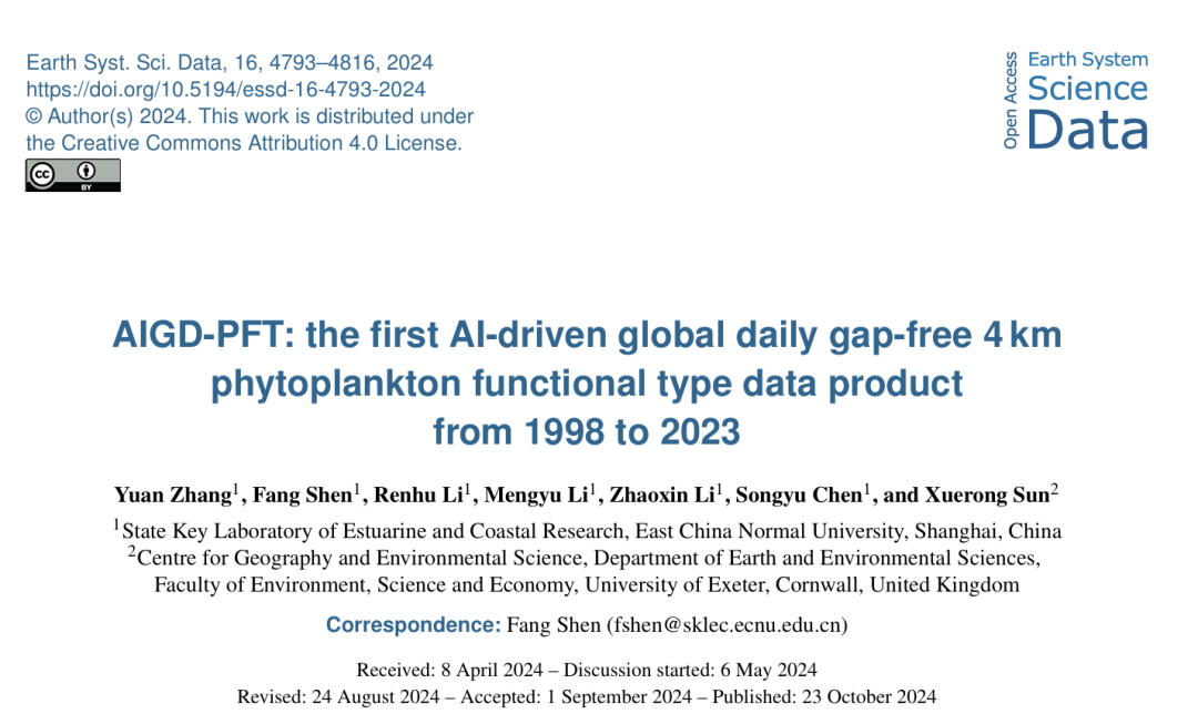 該研究成果以“AIGD-PFT: the first AI-driven global daily gap-free 4?km phytoplankton functional type data product from 1998 to 2023”為題,在線發表于Earth System Science Data期刊。