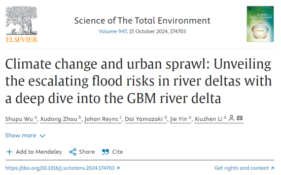 相關成果以“Climate change and urban sprawl: Unveiling the escalating flood risks in river deltas with a deep dive into the GBM river delta”為題發表于環境科學與工程領域期刊Science of the Total Environment上。