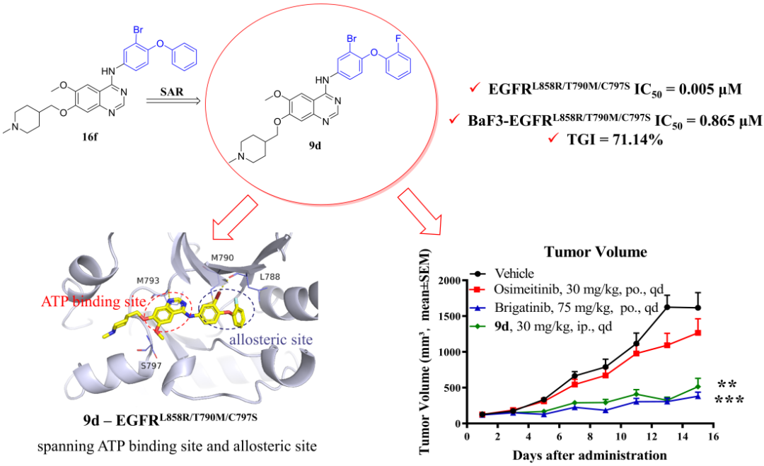 藥學院、人工智能新藥創智中心李洪林教授聯合復旦大學華山醫院李圣青教授、華東理工大學徐玉芳教授、陳卓副研究員在前期工作基礎上(Eur. J. Med. Chem., 244 (2022) 114856)通過合理設計并合成了一系列新型可同時占據EGFR激酶ATP結合位點和變構位點二苯醚取代的4-氨基喹唑啉衍生物。其中,化合物9d對于EGFRL858R/T790M/C797S的激酶活抑制活性為0.005μM。進一步的體外活性評估顯示,9d能夠通過誘導細胞凋亡和G2期周期阻滯方式有效抑制BaF3-EGFRL858R/T790M/C797S細胞的增殖,同時在BaF3-EGFRL858R/T790M/C797S細胞中以濃度依賴的方式抑制EGFR的磷酸化,并在BaF3-EGFRL858R/T790M/C797S異種移植瘤小鼠模型中顯示出顯著的抗腫瘤作用(30 mg/kg,TGI=71.14%)。以上結果表明化合物9d是一種潛在的可以克服EGFR-C797S耐藥突變的第四代EGFR抑制劑,具有進一步開發的價值。