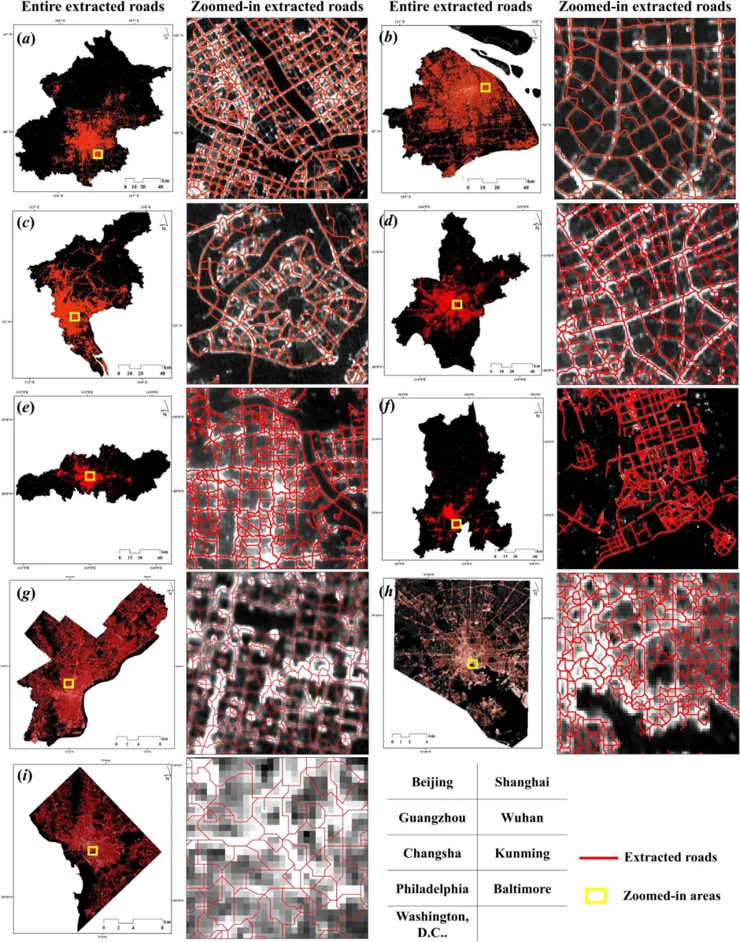 地理科學學院余柏蒗教授科研團隊創新性地提出了一種基于地形骨架的道路提取方法,將夜光數據類比為連續地形表面,將城市道路視為地形脊線,通過解決夜間燈光數據中的地形退化問題實現了道路提取。該方法在全球九個城市中得到了驗證,精度(RGB波段為85%,全色波段為83%)比現有數據和方法顯著提升,首次系統證明國產SDGSAT-1夜間燈光數據在城市主要道路提取中的巨大潛力。該研究成果以“Potential of SDGSAT-1 nighttime light data in extracting urban main roads”為題發表在Remote Sensing of Environment上。
