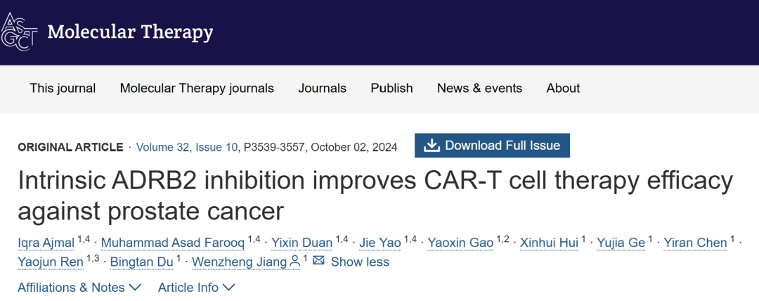 相關成果于9月2日以“Intrinsic ADRB2 inhibition improves CAR-T cell therapy efficacy against prostate cancer”為題,發表在Molecular Therapy上。