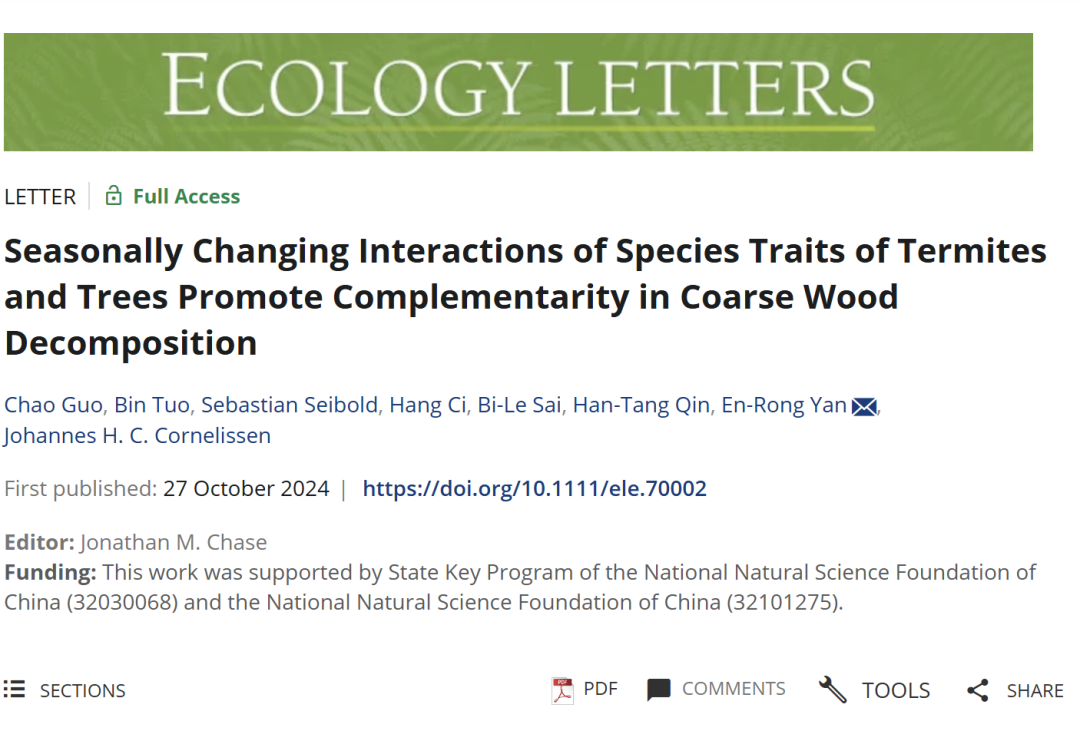 相關成果以“Seasonally Changing Interactions of Species Traits of Termites and Trees Promote Complementarity in Coarse Wood Decomposition”為題發表在國際生態學頂級期刊Ecology Letters上。