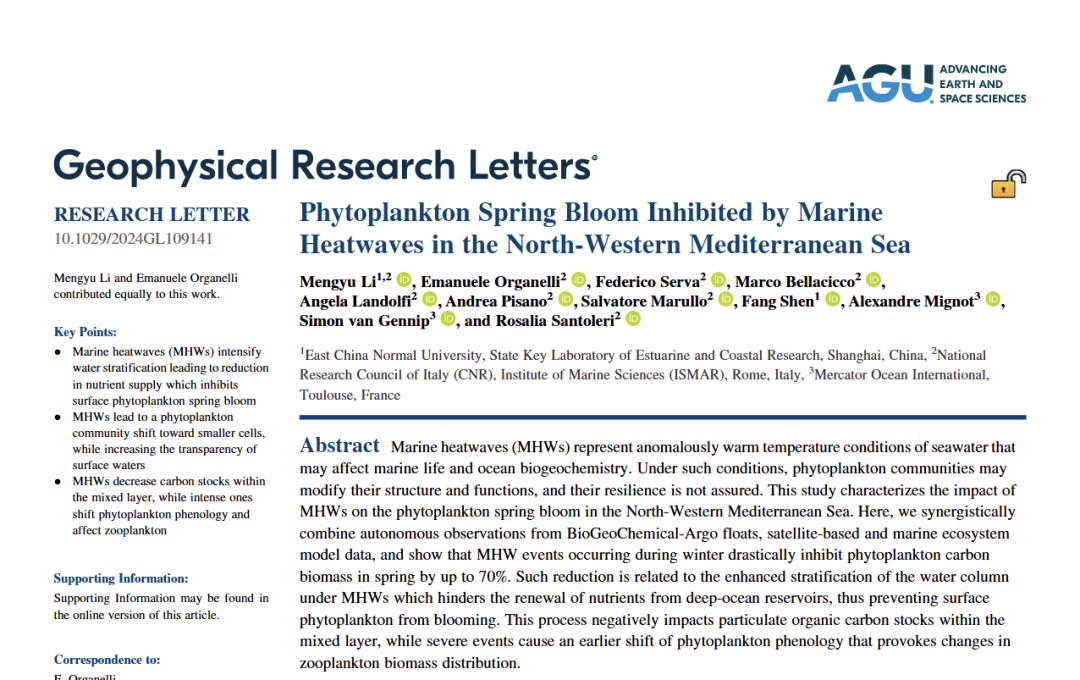 相關研究成果以“Phytoplankton Spring Bloom Inhibited by Marine Heatwaves in the North-Western Mediterranean Sea”為題,于2024年10月發表在Geophysical Research Letters期刊上。