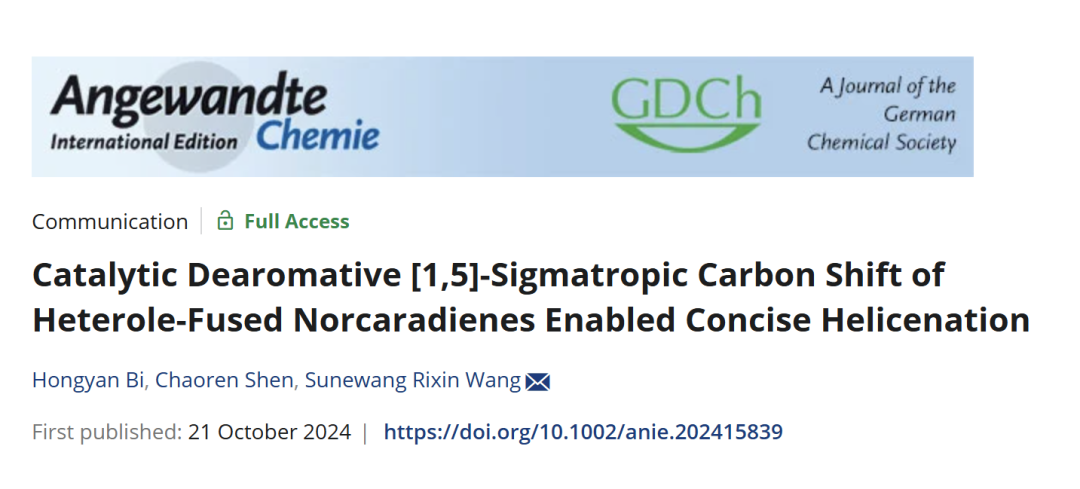 該研究成果“Catalytic Dearomative [1,5]-Sigmatropic Carbon Shift of Heterole-Fused Norcaradienes Enabled Concise Helicenation”發表在Angewandte Chemie International Edition,第一作者為博士研究生閉紅艷(已畢業),理論計算由沈超仁博士完成。