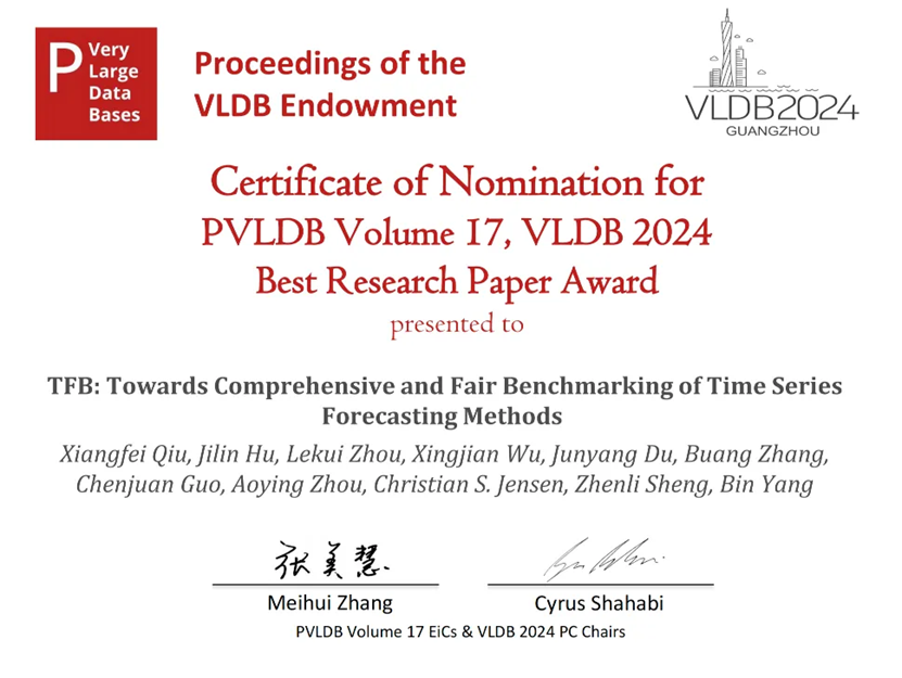 2024年8月26-29日,在中國廣州舉辦了國際數據庫頂級會議VLDB 2024(International Conference on Very Large Databases),數據科學與工程學院周傲英教授、楊彬教授、郭晨娟教授、胡吉林教授、與丹麥奧爾堡大學Christian S. Jensen教授、華為云周樂夔博士和盛鎮醴博士合作的論文“TFB: Towards Comprehensive and Fair Benchmarking of Time Series Forecasting Methods”獲得大會最佳研究論文獎提名Best Research Paper Award Nomination。胡吉林教授擔任本文通訊作者,其與楊彬教授指導的碩士生邱翔飛、吳行健、杜駿揚和張布昂為學生作者。