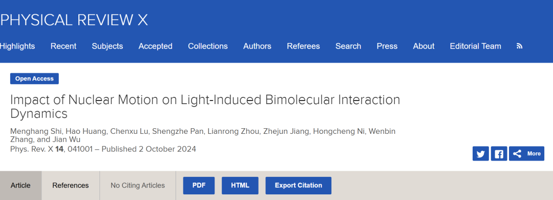 研究成果以“Impact of Nuclear Motion on Light-Induced Bimolecular Interaction Dynamics”為題發表于Physical Review X。華東師范大學為第一單位,張文斌研究員、倪宏程研究員、吳健教授為論文通訊作者,博士研究生石夢航、黃昊、陸晨旭為論文共同第一作者。