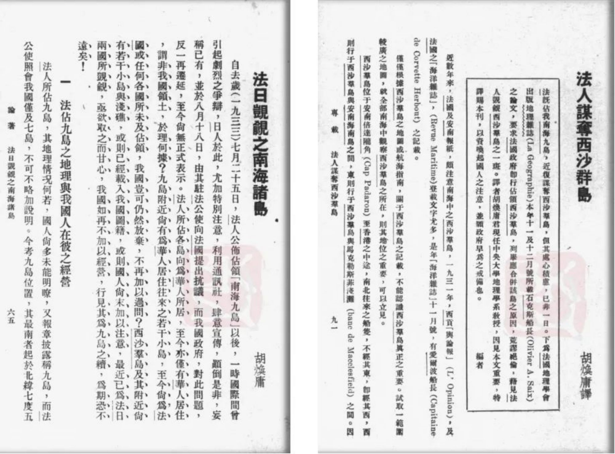 1934年,胡煥庸在《外交評論》刊物上發表《法日覬覦之南海諸島》和《法人謀奪西沙群島》