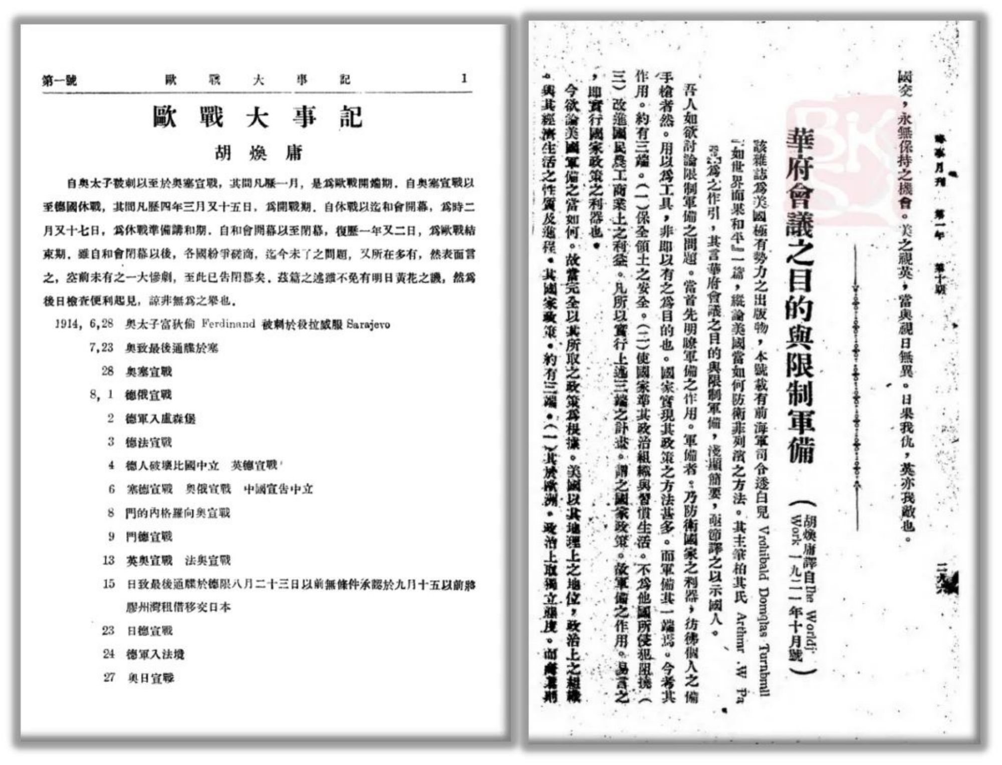 1921年,胡煥庸發表自己的首篇論文《歐戰大事記》與譯文《華府會議之目的與限制軍備》