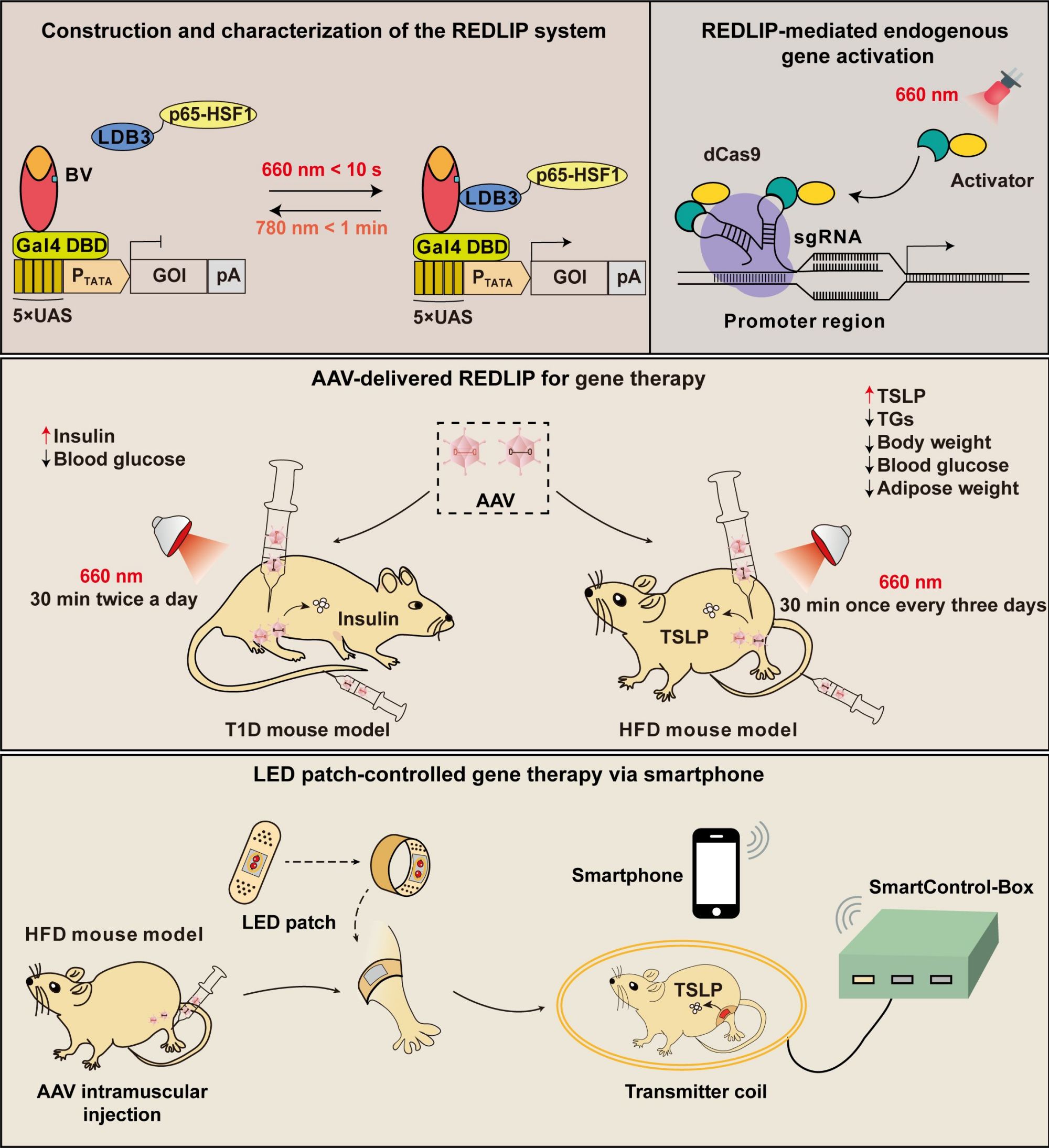作為概念驗證,研究人員利用AAV基因治療載體遞送REDLIP系統到代謝疾病小鼠的肌肉、肝臟組織,成功實現了光控胰島素、減肥治療蛋白TSLP的表達,從而有效降低了1型糖尿病模型小鼠的血糖水平和減輕了肥胖模型小鼠的體重。