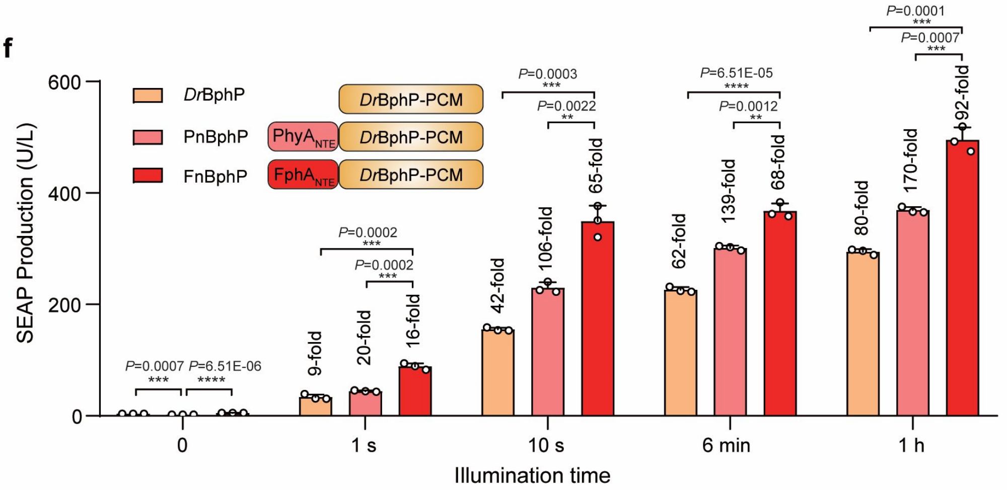 研究人員對不同模塊進行優化和測試,發現Fn-REDLIP系統具有較高的激活能力,Pn-REDLIP系統具有較底的本底泄露(圖2)。緊接著研究人員對REDLIP系統進行動力學表征。研究結果顯示,REDLIP系統具有良好的光譜特異性,光照強度、光照時間、以及高度的可逆性和時空特異性。該系統具有超高的靈敏度,只需要10秒鐘的紅光照射,即可實現100倍左右的基因誘導表達效果。