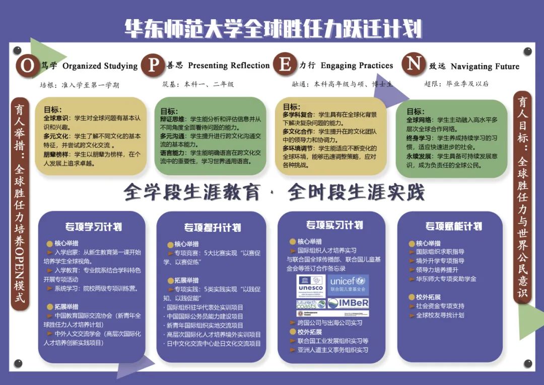華東師大高度重視國際化人才培養工作,積極探索創新實踐,為學生提供了廣闊的國際交流與合作平臺;以“OPEN”理念打造全球勝任力育人核心舉措,推出“全球勝任力躍遷計劃”,開展篤學(Organized Studying)、善思(Presenting Reflection)、力行(Engaging Practices)和致遠(Navigating Future)為關鍵環節的全學段生涯教育、全時段生涯實踐,有效培養華東師大學生的全球勝任力和中國情懷、國際視野和世界胸懷。近三年來,學校與教育部中外人文交流中心、教育部中國教育國際交流協會等單位緊密合作,每年輸送90余名青年學子赴聯合國總部參與實訓;與聯合國新聞傳播部、兒基會等簽訂戰略合作協議,每年選派30余名青年學子赴聯合國教科文組織、工發組織、兒基會、全球傳播部等國際組織實習。