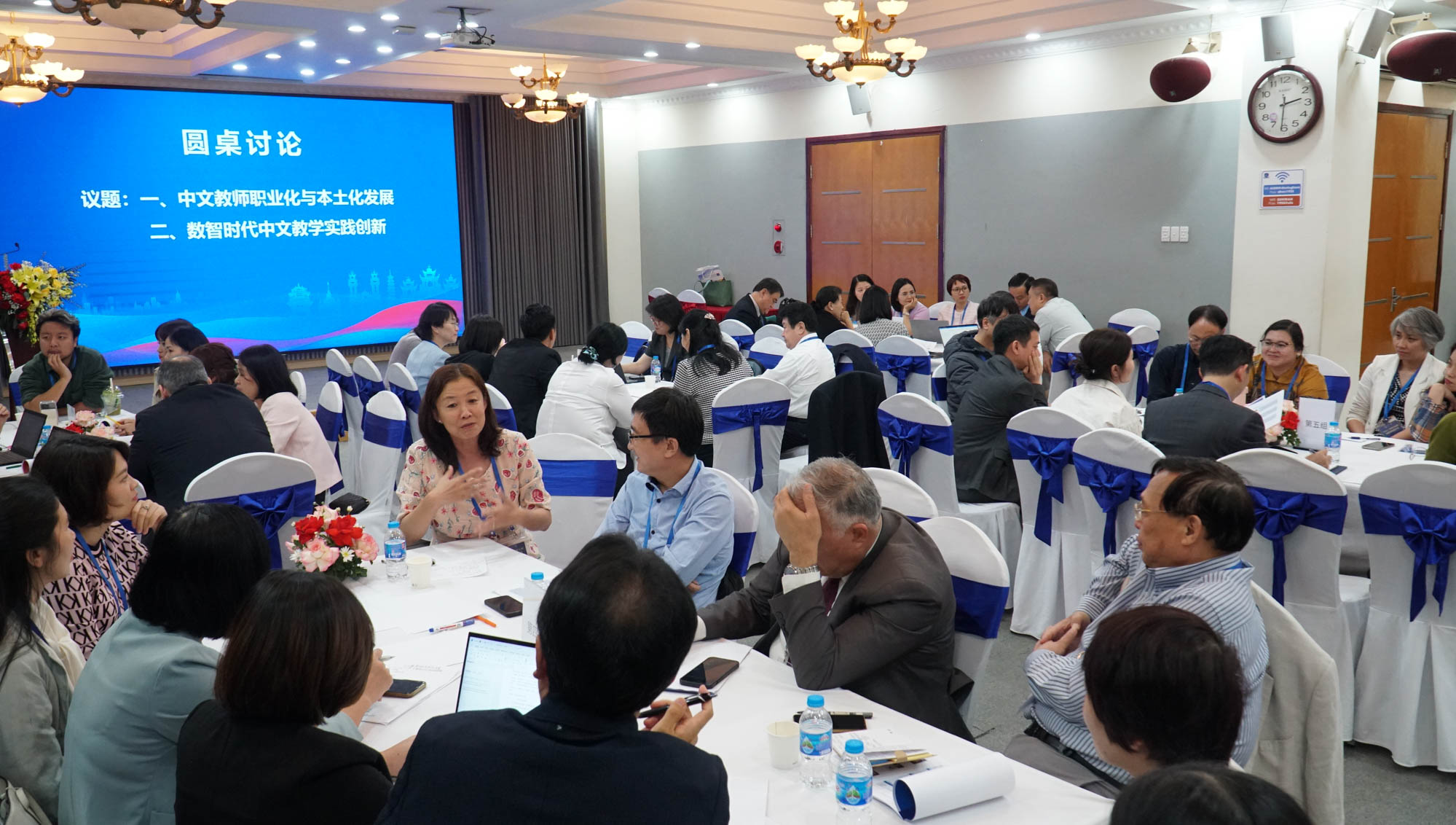 參會代表圍繞中文教師職業(yè)化與本土化發(fā)展、數(shù)智時代中文教學(xué)實踐創(chuàng)新等議題分小組展開圓桌討論。英國諾丁漢大學(xué)副教授王維群、加拿大卡爾加里大學(xué)教授蔡薇、越南河內(nèi)國家大學(xué)下屬外國語大學(xué)中文系主任范明進(jìn)(Pham Minh Tien)、國立韓國教員大學(xué)教授金錫永(Kim Sok Yong)、越南河內(nèi)國家大學(xué)下屬外國語大學(xué)副教授阮廷賢(Nguyen Dinh Hien)作為小組召集人進(jìn)行總結(jié)發(fā)言。與會嘉賓認(rèn)為中文教師職業(yè)化與本土化應(yīng)根據(jù)不同國家的實際情況設(shè)立適當(dāng)?shù)臉?biāo)準(zhǔn),并注重本土教師的培養(yǎng)和教材本土化;ChatGPT等人工智能工具雖能在教學(xué)中發(fā)揮輔助作用,包括結(jié)合虛擬現(xiàn)實的創(chuàng)新教學(xué)方式來提升學(xué)習(xí)體驗,但也需謹(jǐn)慎應(yīng)對其帶來的挑戰(zhàn),技術(shù)應(yīng)用應(yīng)平衡師生互動與教學(xué)質(zhì)量。