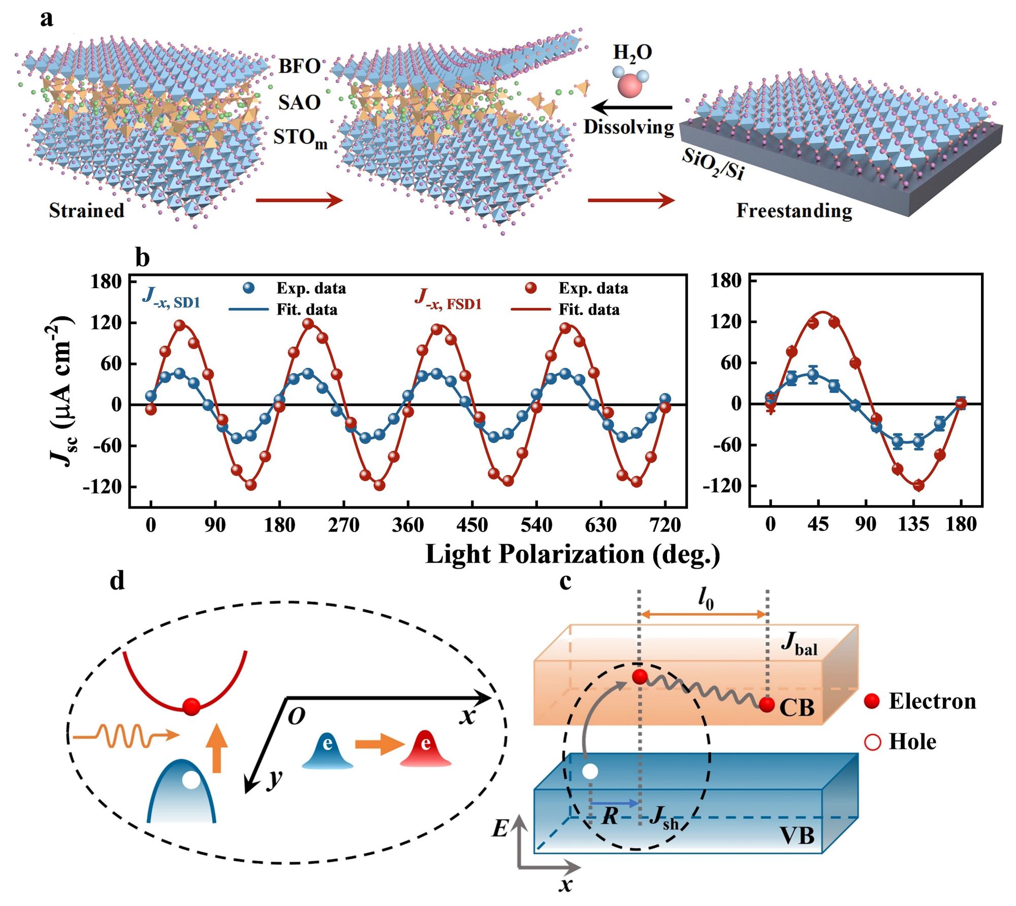 體光伏效應(Bulk Photovoltaic Effect)是一種存在于非中心對稱材料中的新型光伏效應。體光伏效應具有偏振光的角度分辨性以及突破pn結光伏電池Shockley-Queisser理論極限的潛力,這些獨特優勢使得體光伏效應成為光伏領域的研究前沿和熱點。另一方面,自支撐氧化物薄膜是一種將外延氧化物薄膜從襯底剝離后獨立存在的薄膜形態。由于擺脫了襯底應力約束,自支撐氧化物薄膜已展現出超彈性、單層鐵電性、鐵電拓撲和撓曲電光伏耦合效應等多種新奇物理現象,這使得自支撐氧化薄膜成為研究各種新奇物性的理想平臺。從對稱性角度分析,自支撐氧化物薄膜帶來晶體對稱性變化,這有望改變其體光伏效應。但是,自支撐氧化物薄膜的體光伏效應究竟如何,是否表現出類似的新奇特性,尚缺乏實驗研究。