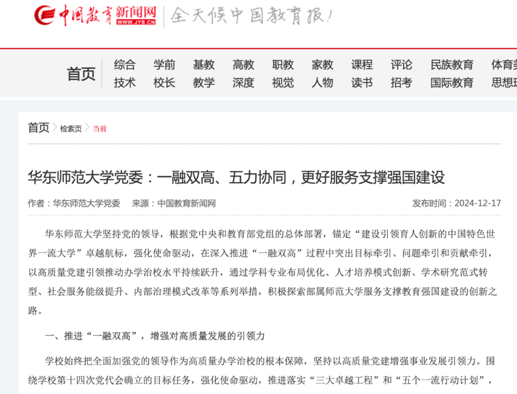 12月18日,《中國教育報》三版發表華東師范大學黨委署名文章《扎實推進“一融雙高” 探索創新之路》。