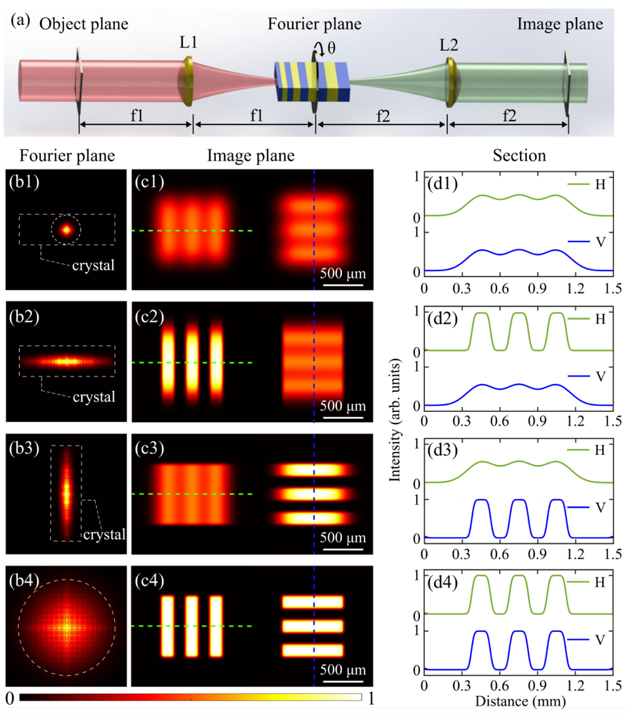 迄今,上轉(zhuǎn)換探測技術(shù)已被成功應(yīng)用于許多高性能紅外成像場景,在探測靈敏度與成像幀頻上展現(xiàn)出巨大優(yōu)勢。然而上轉(zhuǎn)換成像系統(tǒng)由于依賴于非線性轉(zhuǎn)換,不可避免地受到頻譜孔徑限制,對于成像空間分辨率造成了顯著影響,長期以來難以實(shí)現(xiàn)兼具大視場與高分辨的成像性能。為了提高系統(tǒng)的轉(zhuǎn)換效率,上轉(zhuǎn)換過程通常采用基于準(zhǔn)相位匹配的光參量波長轉(zhuǎn)換,可以避免光場波矢間的空間走離,具有較長的相互作用距離。但是,該技術(shù)需要采用特殊結(jié)構(gòu)設(shè)計(jì)的非線性晶體,通過在晶體內(nèi)部施加強(qiáng)電場(達(dá)數(shù)萬伏特/毫米)等方式產(chǎn)生規(guī)律性的疇反轉(zhuǎn),以引入非線性極化率的周期躍變。受限于當(dāng)前制備工藝,在保證極化結(jié)構(gòu)精確度與一致性的前提下,周期極化晶體的厚度通常在毫米量級。所獲得的晶體孔徑極大限制了4f成像系統(tǒng)中空間頻譜的工作帶寬。因此,為了獲得更高的空間分辨率,迫切需要發(fā)展新型的非線性成像架構(gòu),從而突破現(xiàn)存非線性介質(zhì)截面尺寸的物理限制,為推進(jìn)紅外上轉(zhuǎn)換成像技術(shù)更為廣泛的應(yīng)用奠定基礎(chǔ)。
