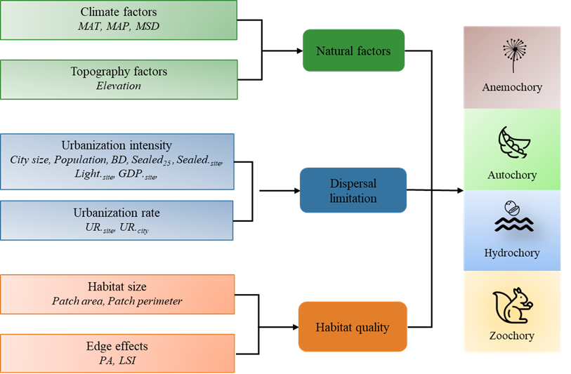 圖1 不同種子擴散類型城市自生植物多樣性影響因子的概念框架