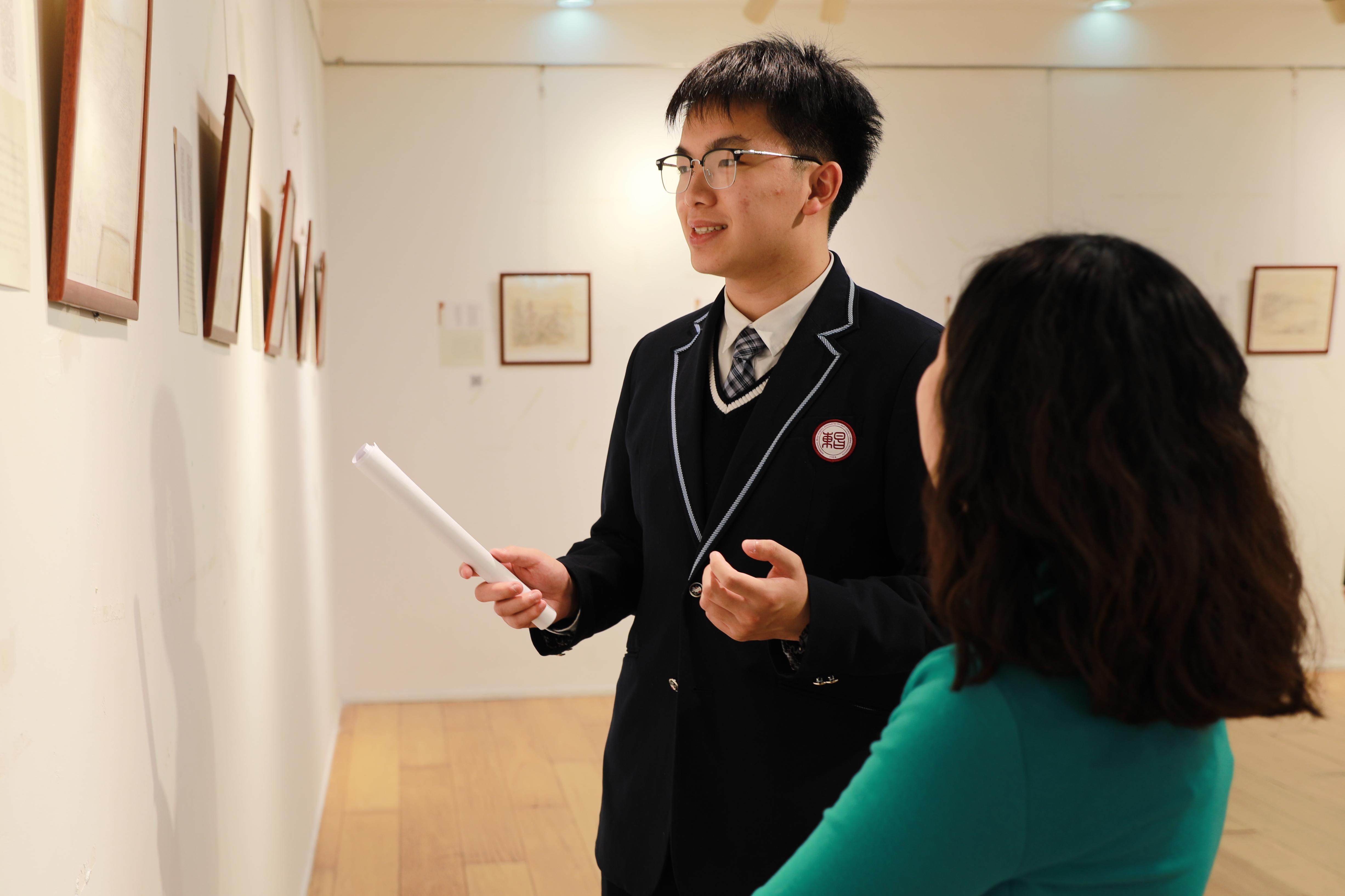 12月27日,在櫻桃河之畔的華東師范大學(xué)閔行校區(qū)圖書(shū)館里,一場(chǎng)名為“讓古籍在指尖重生:照進(jìn)美術(shù)教育的文物修復(fù)之光”的展覽悄然拉開(kāi)序幕。展覽現(xiàn)場(chǎng),十位來(lái)自附屬東昌中學(xué)的高中生,身著統(tǒng)一的校服,眼神中閃爍著對(duì)古籍修復(fù)的熱愛(ài)與敬仰。他們?nèi)缤恍⌒∈刈o(hù)神,穿梭在33件精美的修復(fù)作品之間,為大小觀眾們帶來(lái)了一場(chǎng)別開(kāi)生面的導(dǎo)覽之旅。他們的話語(yǔ)輕柔而富有感染力,引領(lǐng)著每一位觀眾走進(jìn)古籍修復(fù)的世界,感受那份跨越時(shí)空的對(duì)話。與此同時(shí),觀眾還可以通過(guò)音頻導(dǎo)覽,聆聽(tīng)那些殘片修復(fù)背后的故事。
