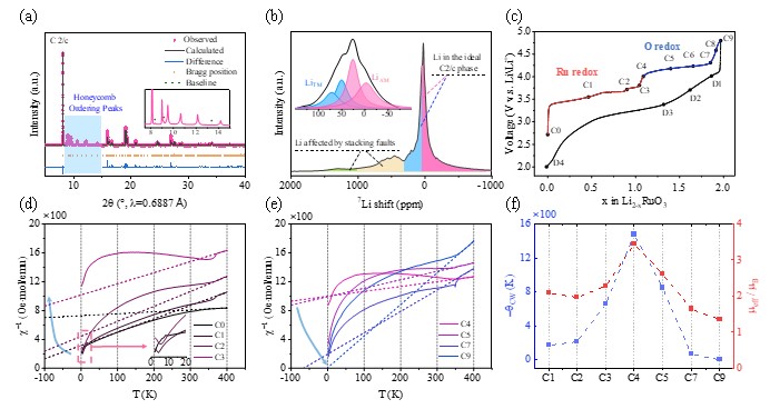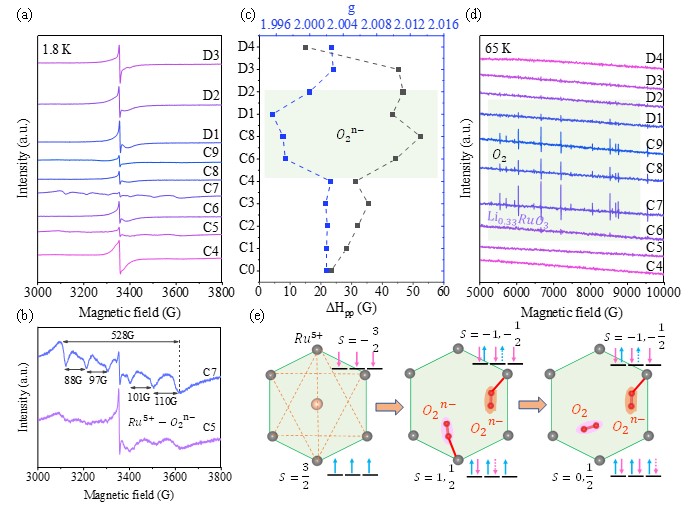 研究發現,Li2RuO3在Ru4+到Ru5+的氧化階段,由于C2/c到R3的結構相變和Ru自旋量子數的增加,磁阻挫會劇烈增加;在陰離子氧化階段,伴隨著氧二聚體和氧氣的形成,強大的磁阻挫得到快速緩解并最終消除。盡管Li2RuO3中Ru-O的共價結合能力較強,但依舊無法阻止氧氣的形成。因此,研究人員指出,富鋰正極的性能改進策略不僅要增強過渡金屬與氧原子之間共價結合,更要緩解蜂窩狀結構中的磁阻挫。