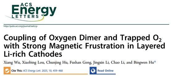 研究成果以“Coupling of Oxygen Dimer and Trapped O2 with Strong Magnetic Frustration in Layered Li-rich Cathodes ”為題,發表于ACS Energy Letters 期刊。華東師范大學為論文第一完成單位,胡炳文教授為論文通訊作者,博士生吳祥為論文第一作者。研究工作得到國家自然科學基金委、華東師范大學公共創新服務平臺(EPR平臺)、合肥物質科學研究院強磁場科學中心的大力支持。