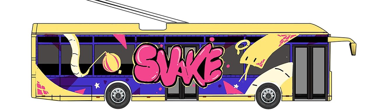 作品簡述:作品以黃色和紫色作為基底,借鑒和運用了街頭涂鴉的表現形式,再輔以可愛的蛇形象和燈籠、煙花等傳統春節元素,以求中西合璧之美。車身背面涂裝中繪制了上海外灘的剪影圖形,與口銜倒福字的蛇共同組成了頗具上海特色的春節畫卷。