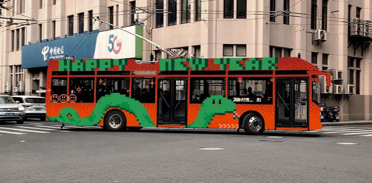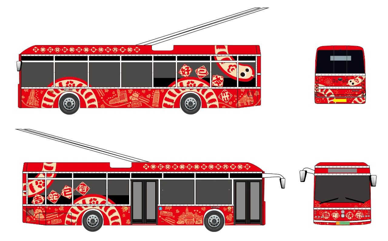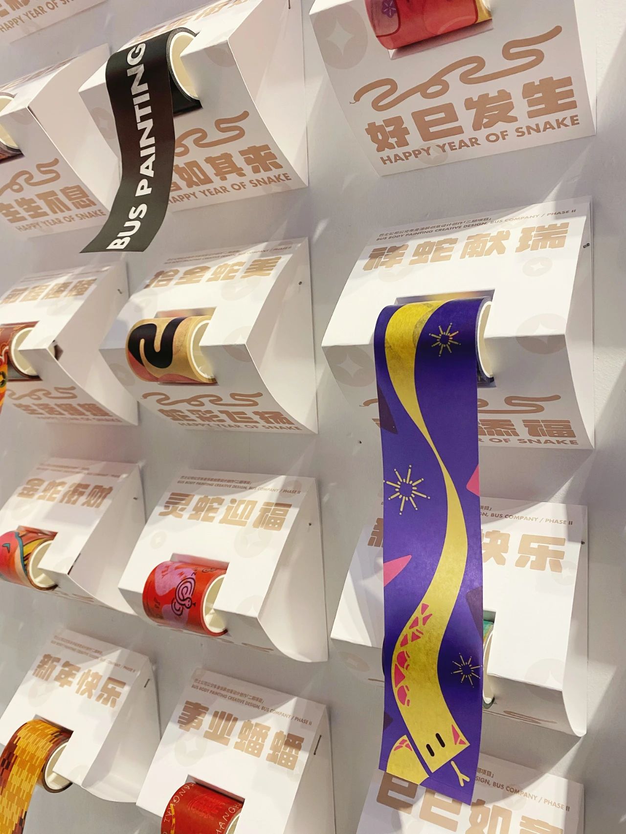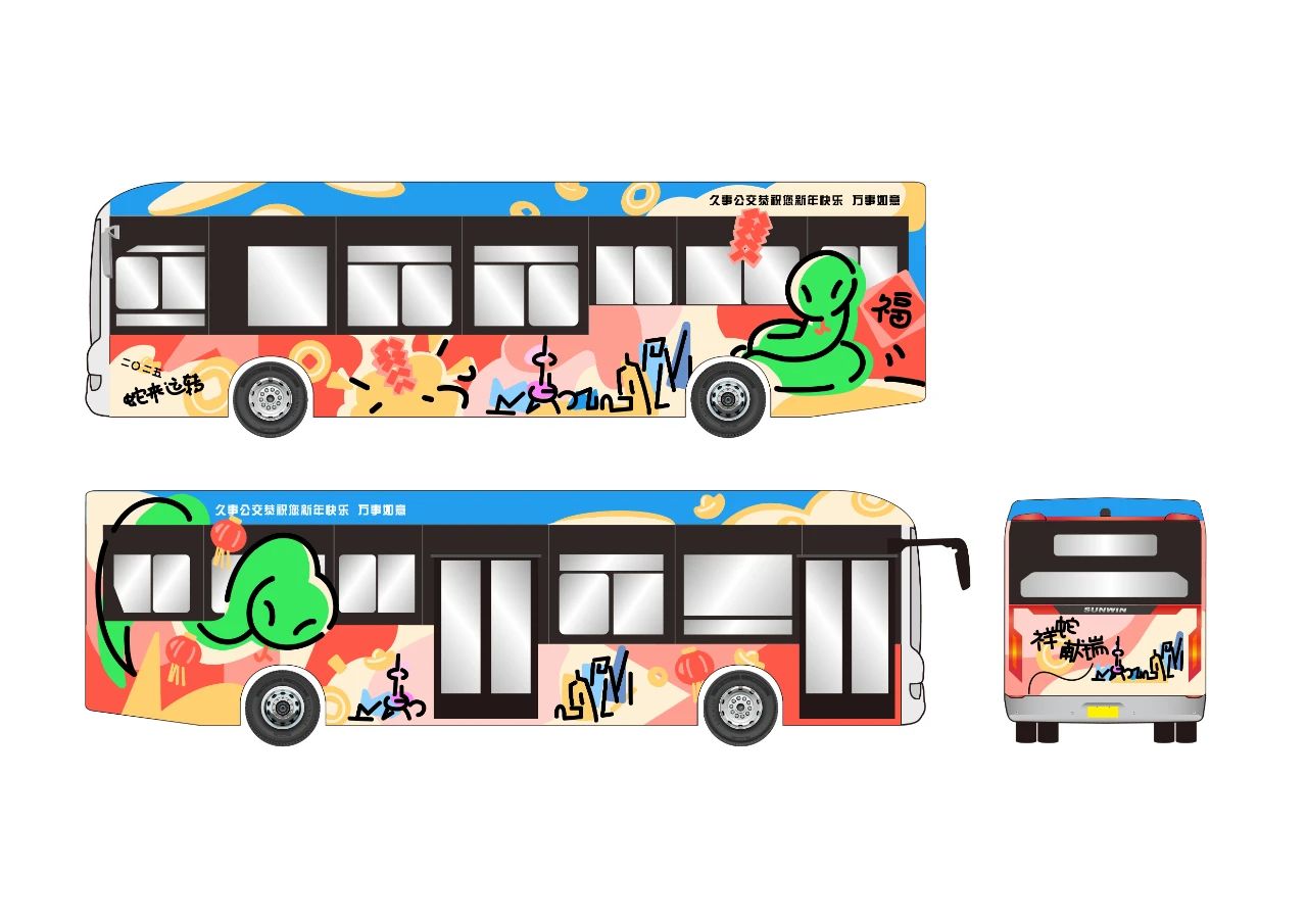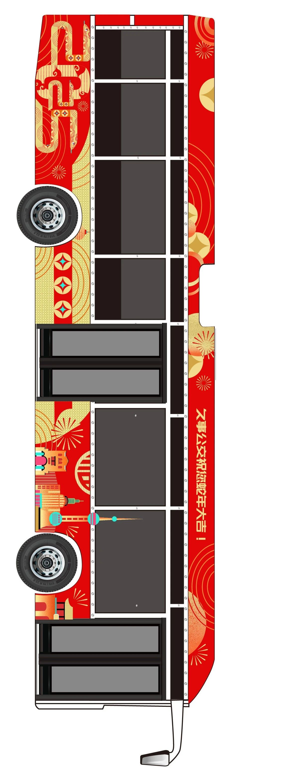 作品簡述:本設計以金蛇舞動迎新春為主題,搭配經典紅金色調,旨在體現春節喜慶洋洋氛圍的同時,展示上海“百年公交”悠久歷史的底蘊。傳統色調與現代平面語言并置,融合了對美的追求和對傳統的尊重,希望為市民和游客帶來愉悅的視覺體驗。