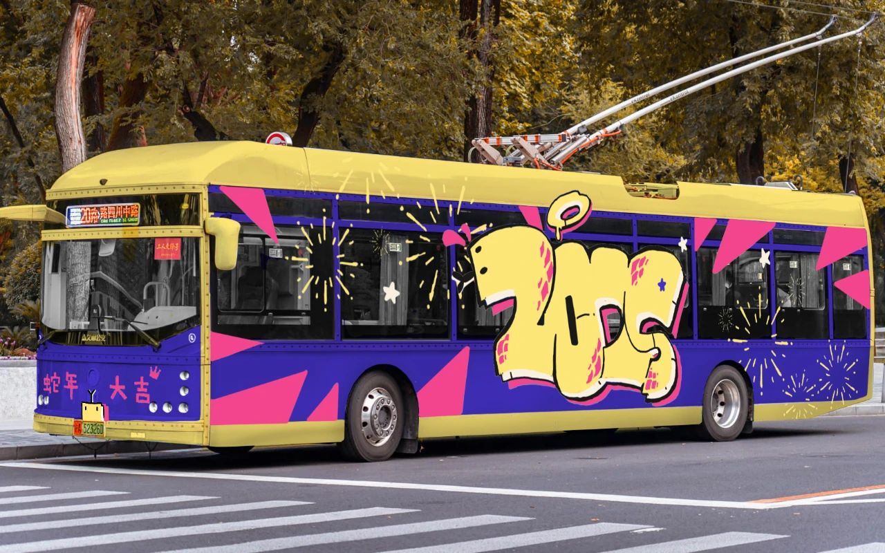 作品簡述:本作品采插畫風格。左面車身以財神爺形象的蛇為主角,背景輔以上海早期建筑,天燈點綴其間,營造出濃厚的傳統節慶氛圍。右面則轉換為舞獅形象的蛇,與上海現代建筑相映成趣,燈籠高掛,彰顯出都市的繁華與活力。