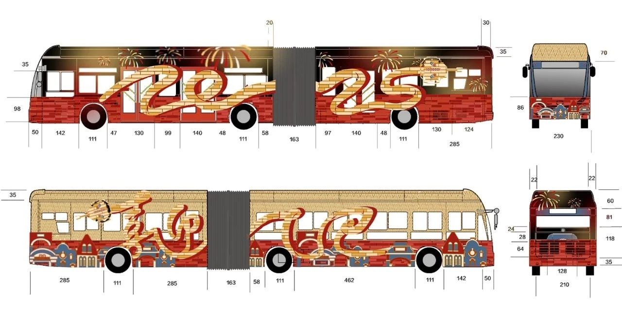 作品簡述:車身以紅金兩色為主色調,融合海派剪紙藝術風格,金蛇纏繞車身寓意好運纏身;蛇身周圍輔以20路公交沿線標志性建筑與主要站點,結合上海特色梧桐區梧桐樹葉,一同展現百年公交20路的歷史風采與今日輝煌。