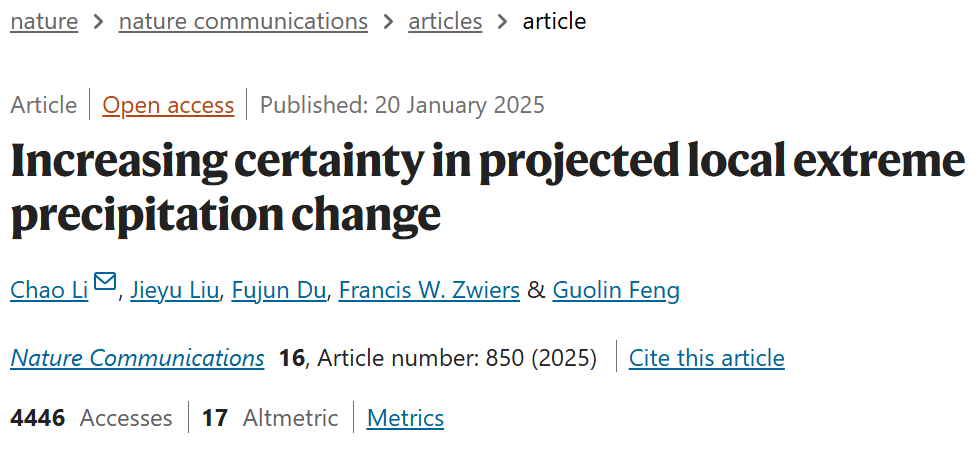 Chao Li, Jieyu Liu, Fujun Du, Francis W. Zwiers, and Guolin Feng. (2025). Increasing certainty in projected local extreme precipitation change. Nature Communications, 16, 850. https://doi.org/10.1038/s41467-025-56235-9
