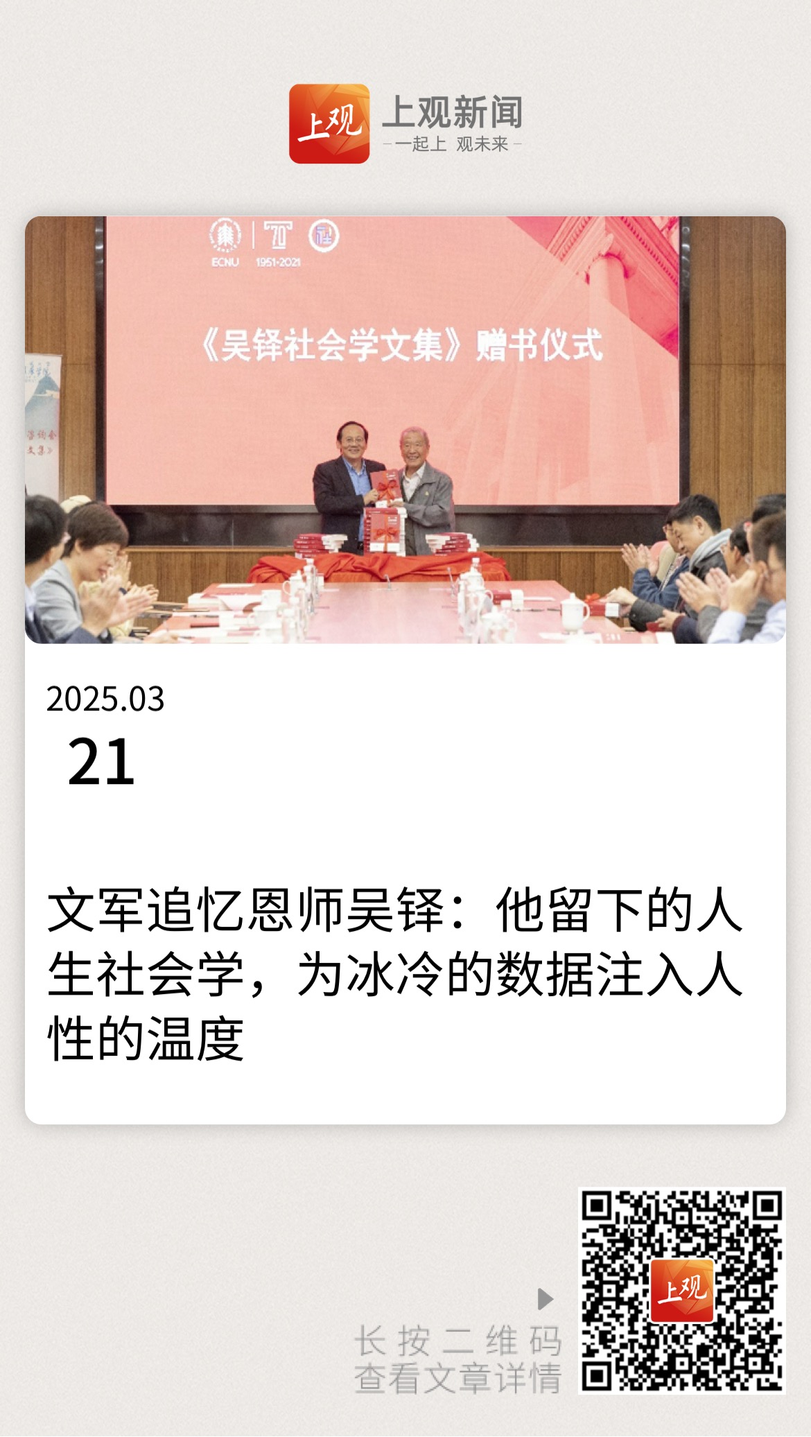 李友梅贊譽吳鐸先生“居功至偉”,他的學術遺產和精神風范已鐫刻于中國社會學發展長卷,激勵后輩在構建中國特色社會學體系征程中賡續前行,永志其“灼灼智識與社會擔當”。