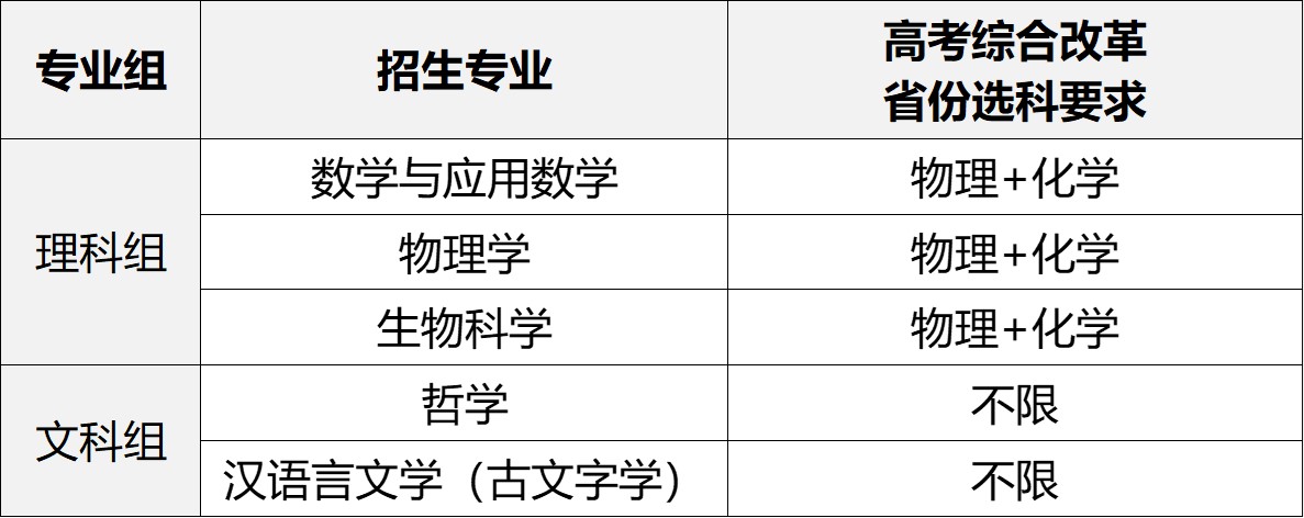 服務(wù)國家重大戰(zhàn)略需求的基礎(chǔ)理科學(xué)科以及國家人才緊缺的社會科學(xué)與人文學(xué)科領(lǐng)域,招生專業(yè)、選考科目、科類要求及招生計劃見下表: